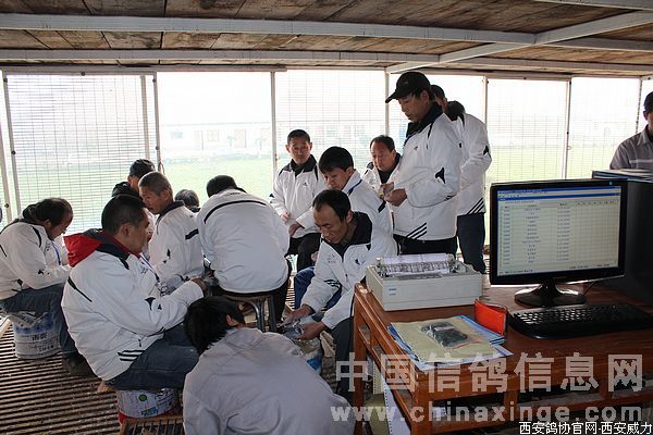 西安市信鸽协会裁判长简伟(左)与裁判员贾文忠(右)正在给赛鸽粘贴不干胶密封软环