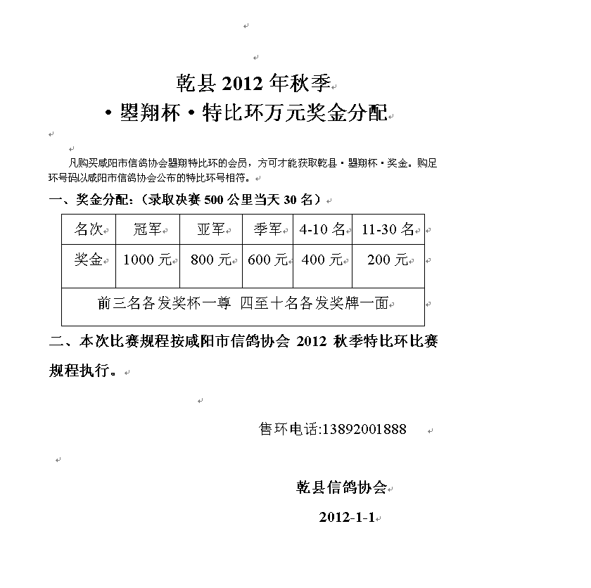 乾县2012年秋季•曌翔杯•特比环万元奖金分配