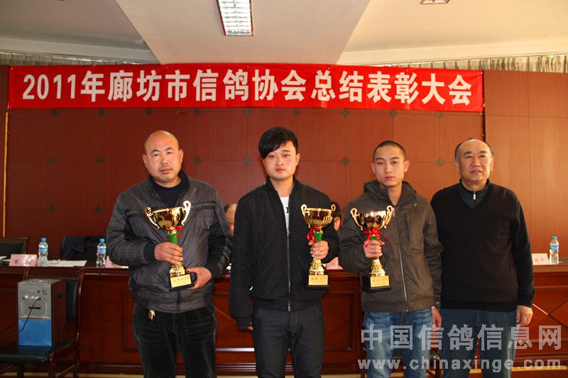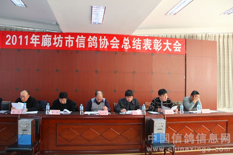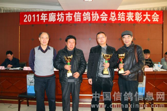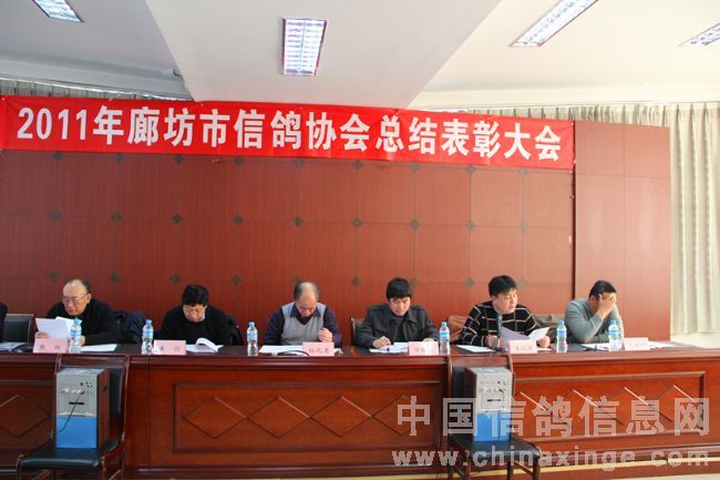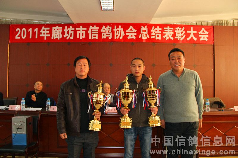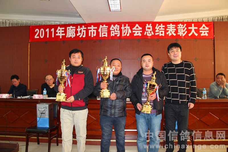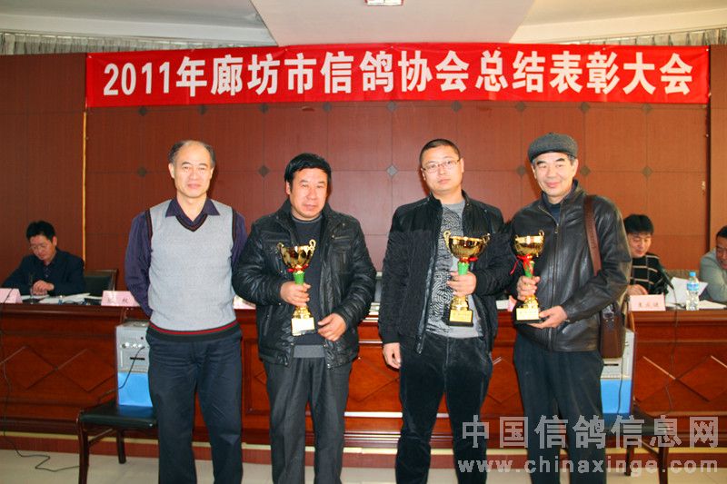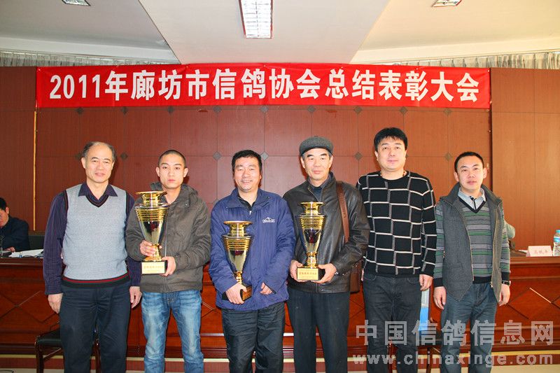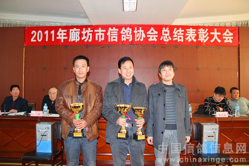 2012年元月14日上午十时,在廊坊市体育局四楼会议室隆重召开了二0一一年度廊坊市信鸽协会总结表彰大会。廊坊市体育总会孙化恩主任、河北省信鸽协会任铁生秘书长、廊坊市信鸽协会顾问黄剑先生、河北省信鸽协会副主席、廊坊市信鸽协会主席王成健先生、廊坊市信鸽协会名誉主席张权先生、副主席马玖平、李金奎、王金忠、孙学顺、赵国田、赵连军、王佰臣、常务副秘书长张旭、副秘书长、竞翔部长贾伟及各县区(市)信鸽协会负责人、会员代表,廊坊市伍龙国际赛鸽公棚代表、永清胜亮、大城豪威公棚法人以及荣获2011年市级比赛前三名的会员共六十余人参加了大会。会议由廊坊市体育局机关书记娄忠先生主持。 二0一一年廊坊市信鸽协会在市体育局、体育总会的直接领导下,在河北省信鸽协会和市民政局指导下,经过全体会员的不懈努力,协会各方面工作均取得了令人可喜的成绩,顺利完成了全年各项工作计划工作。会上,王成健主席从“换届大会取得圆满成功、精心组织训赛,努力提高信鸽竞赛水平、加强对公棚的监督管理、加强裁判员队伍建设,提高裁判员素质、廊坊(国际)名鸽展示会成为中国精品体育旅游项目、存在的问题”几方面作了实事求是的工作总结,对2012年鸽会工作进行了部署。马玖平副主席作了财务报告及宣布了荣获2011年市级比赛前三名名单。体总、省、市协会领导给获奖会员颁发了奖杯。