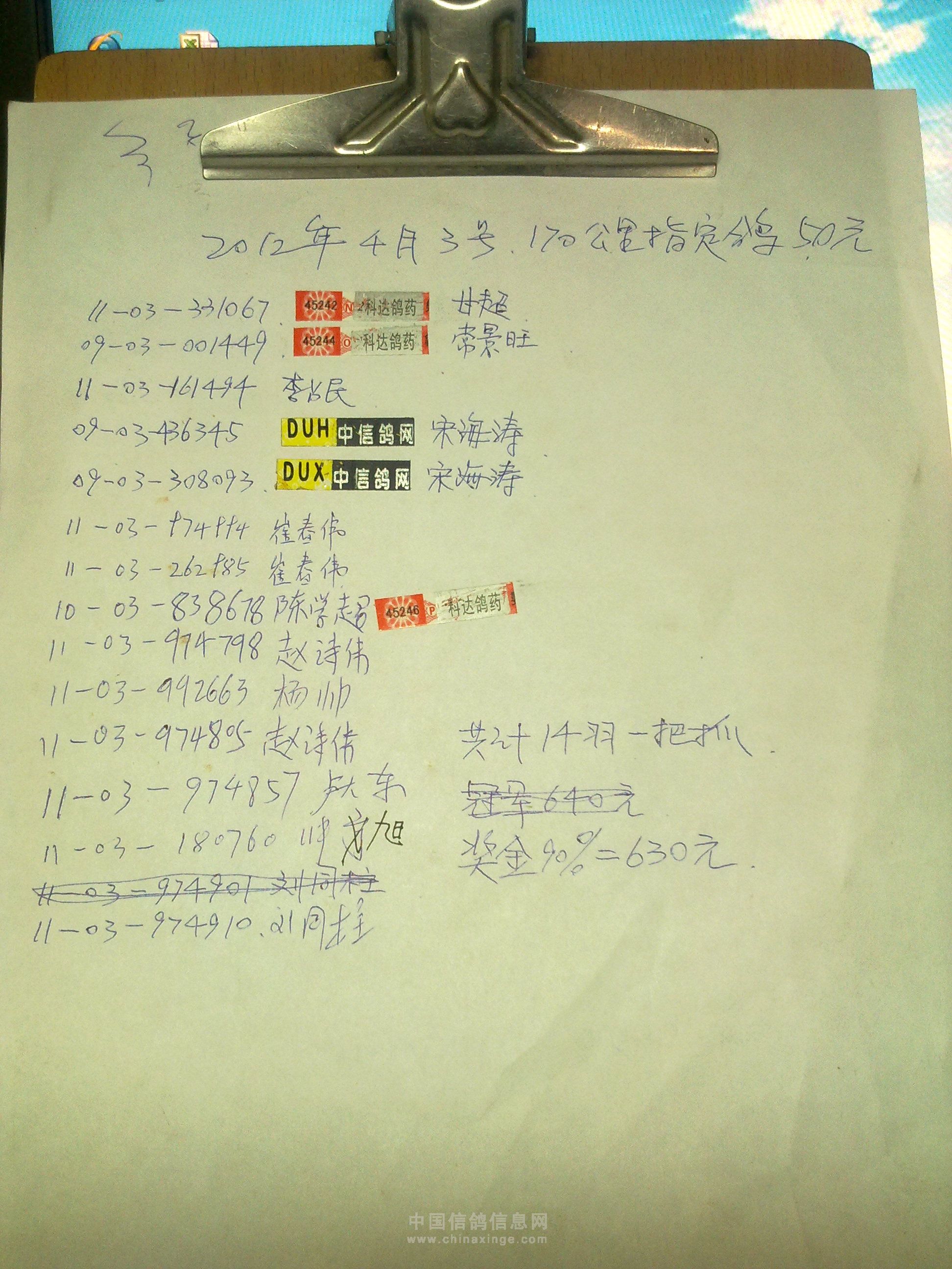 电子扫描:环号请到中鸽赛事直播报名信息.分赛A组中查找
