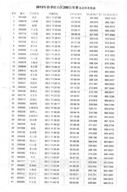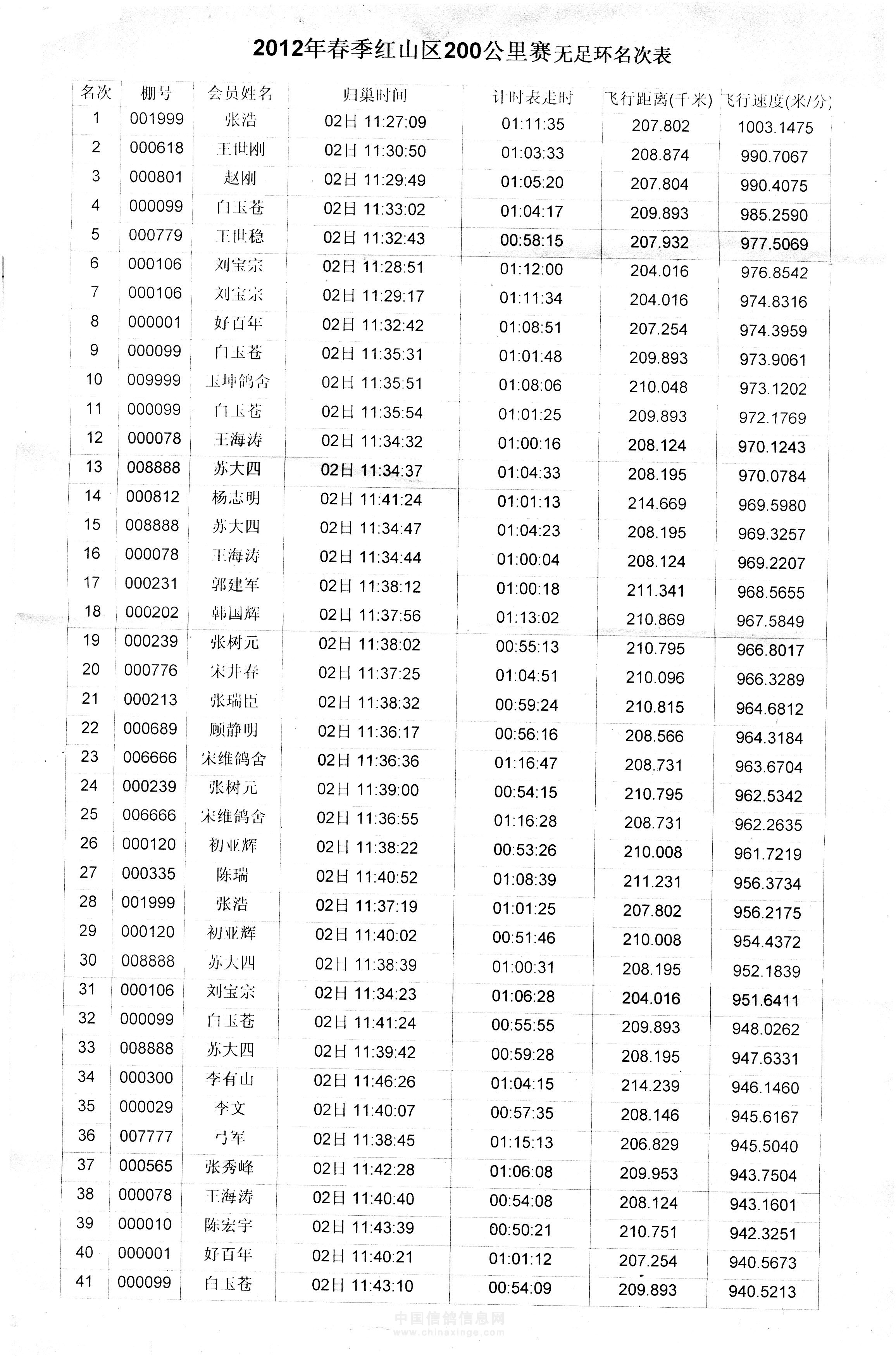 赤峰市红山区信鸽协会2012年春第一站200公里成绩