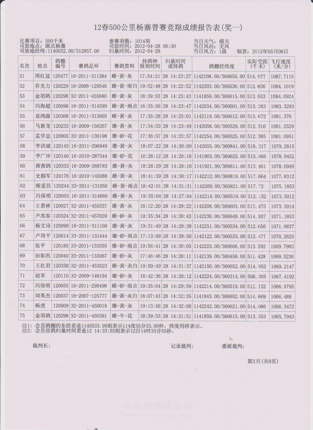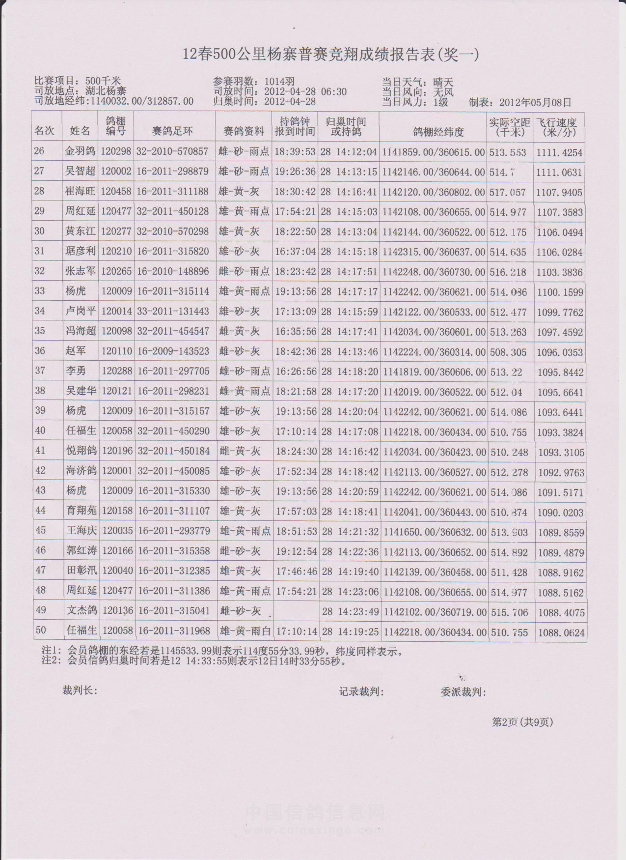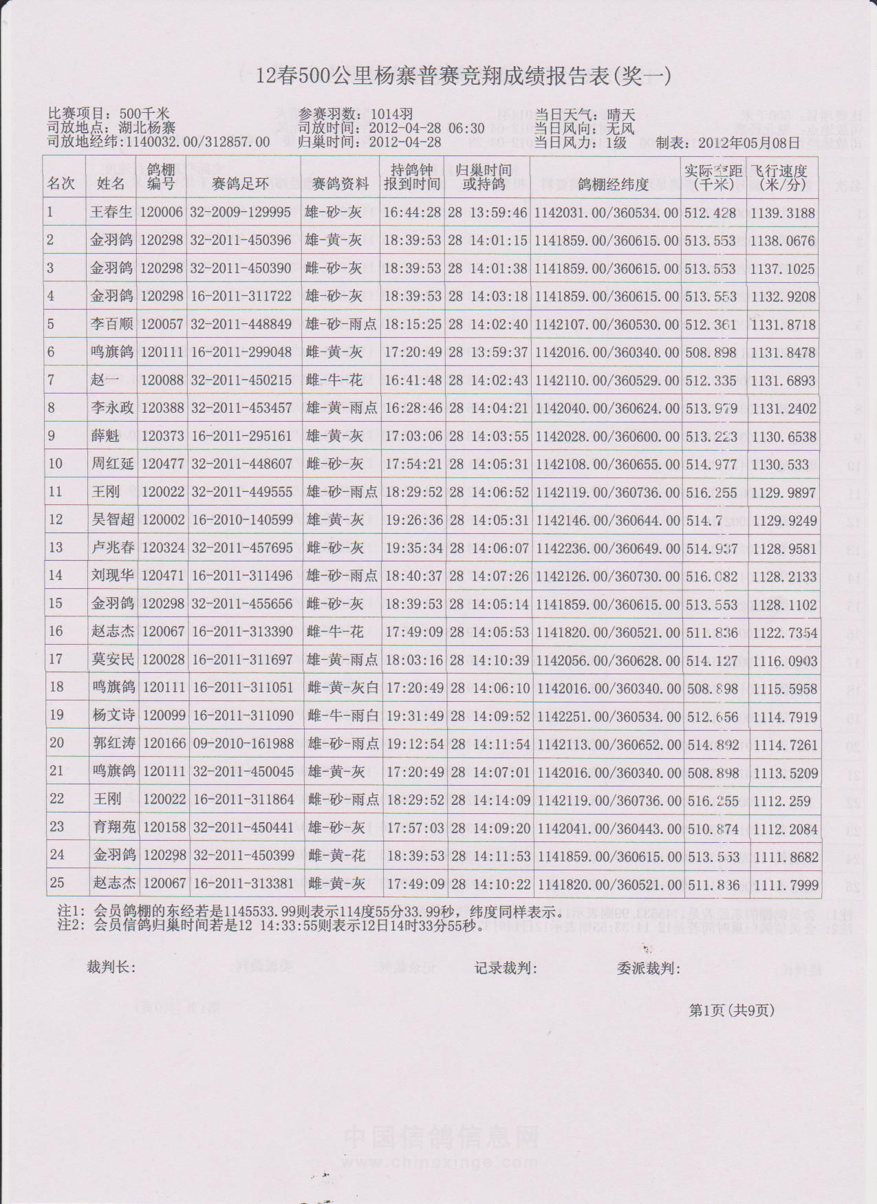 500公里大悟站前十名验鸽(1-2)