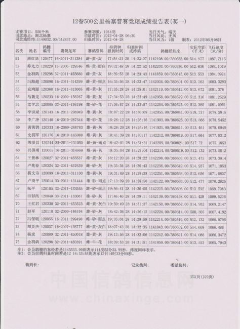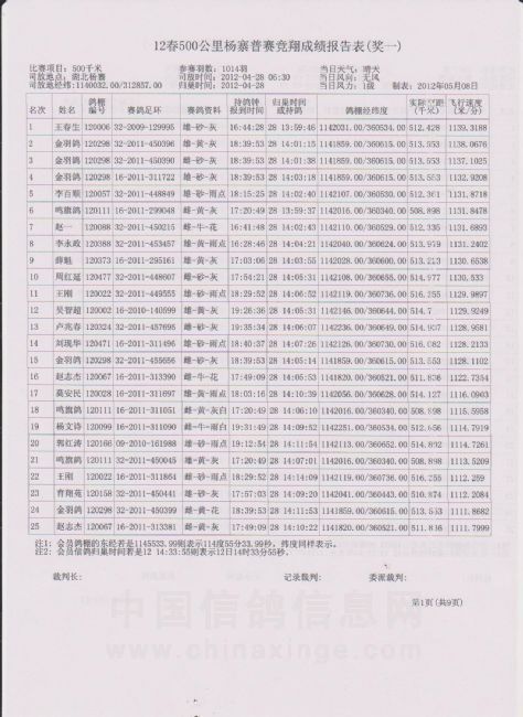 500公里大悟站前十名验鸽(汽车大奖赛冠军)(7-8)
