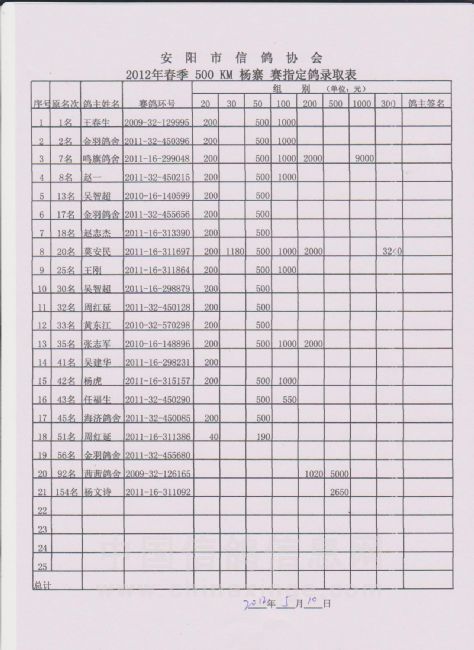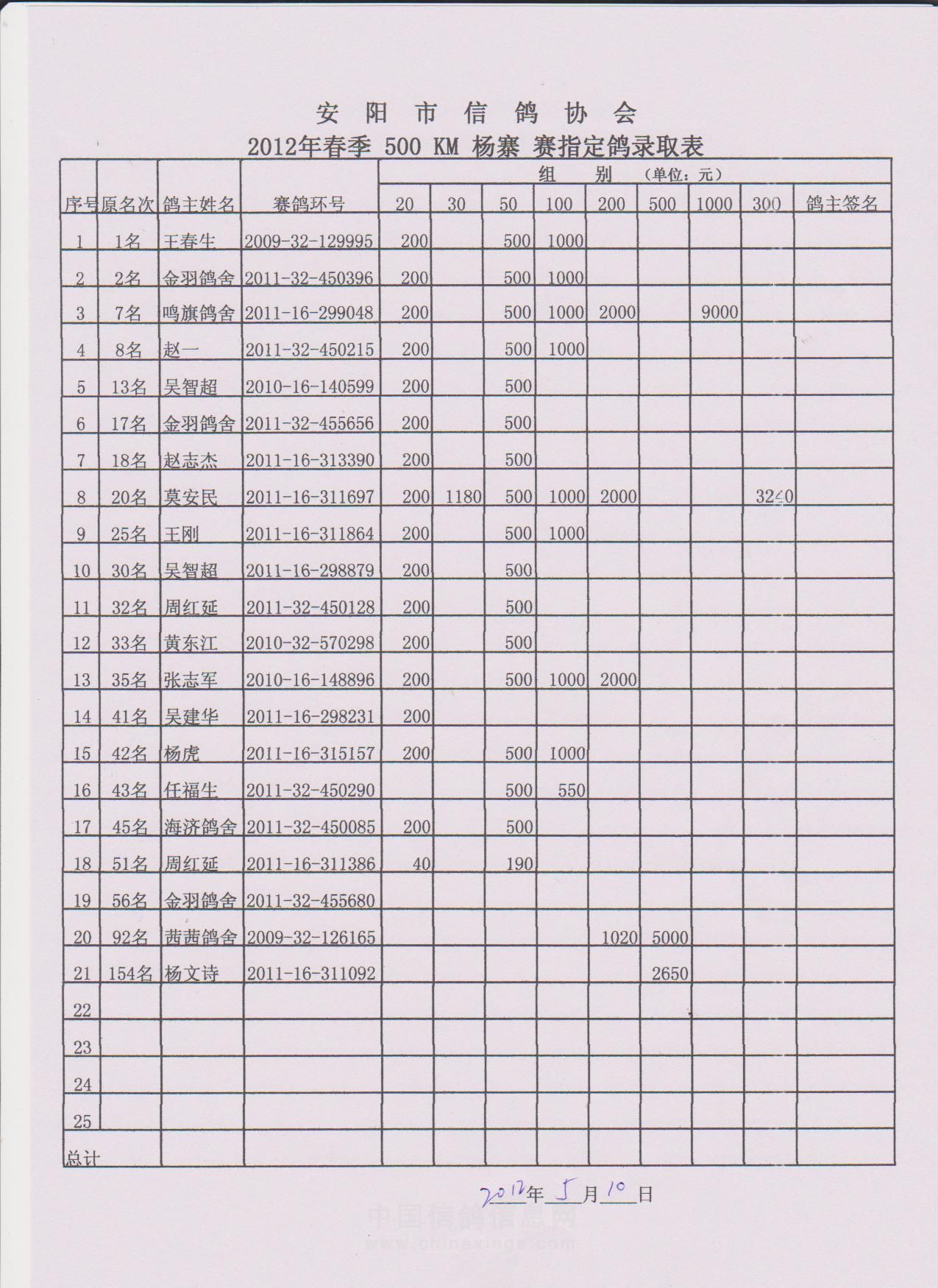 2012春500公里杨寨比赛指定鸽录取表(调整名次后)
