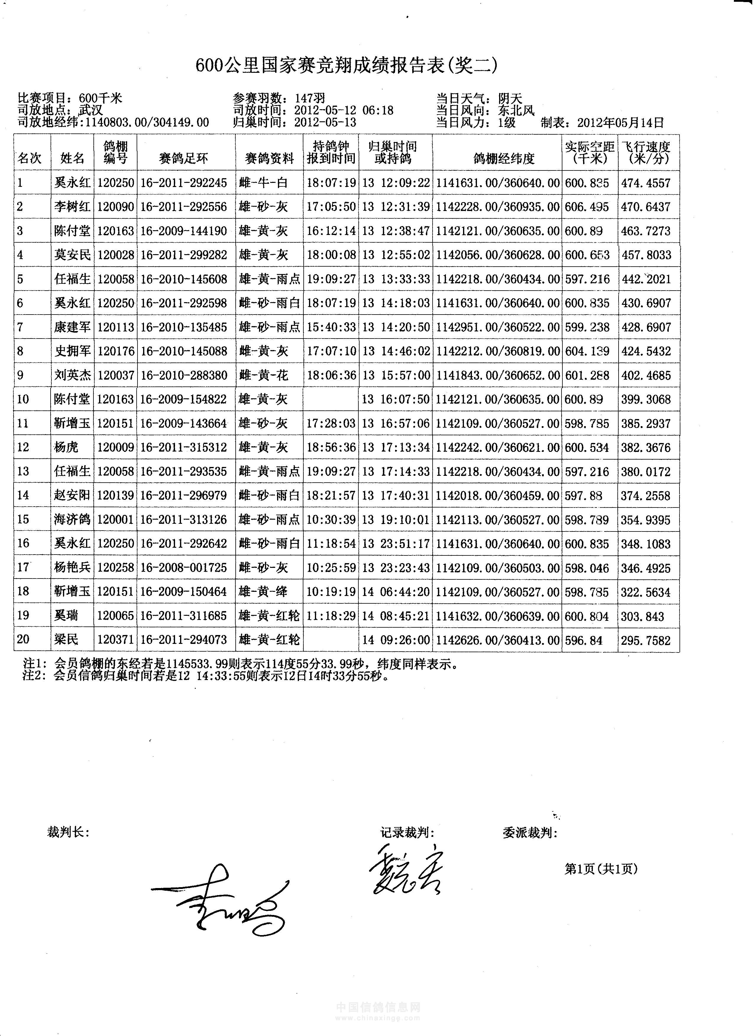 500公里大悟站前十名验鸽(汽车大奖赛冠军)(7-8)