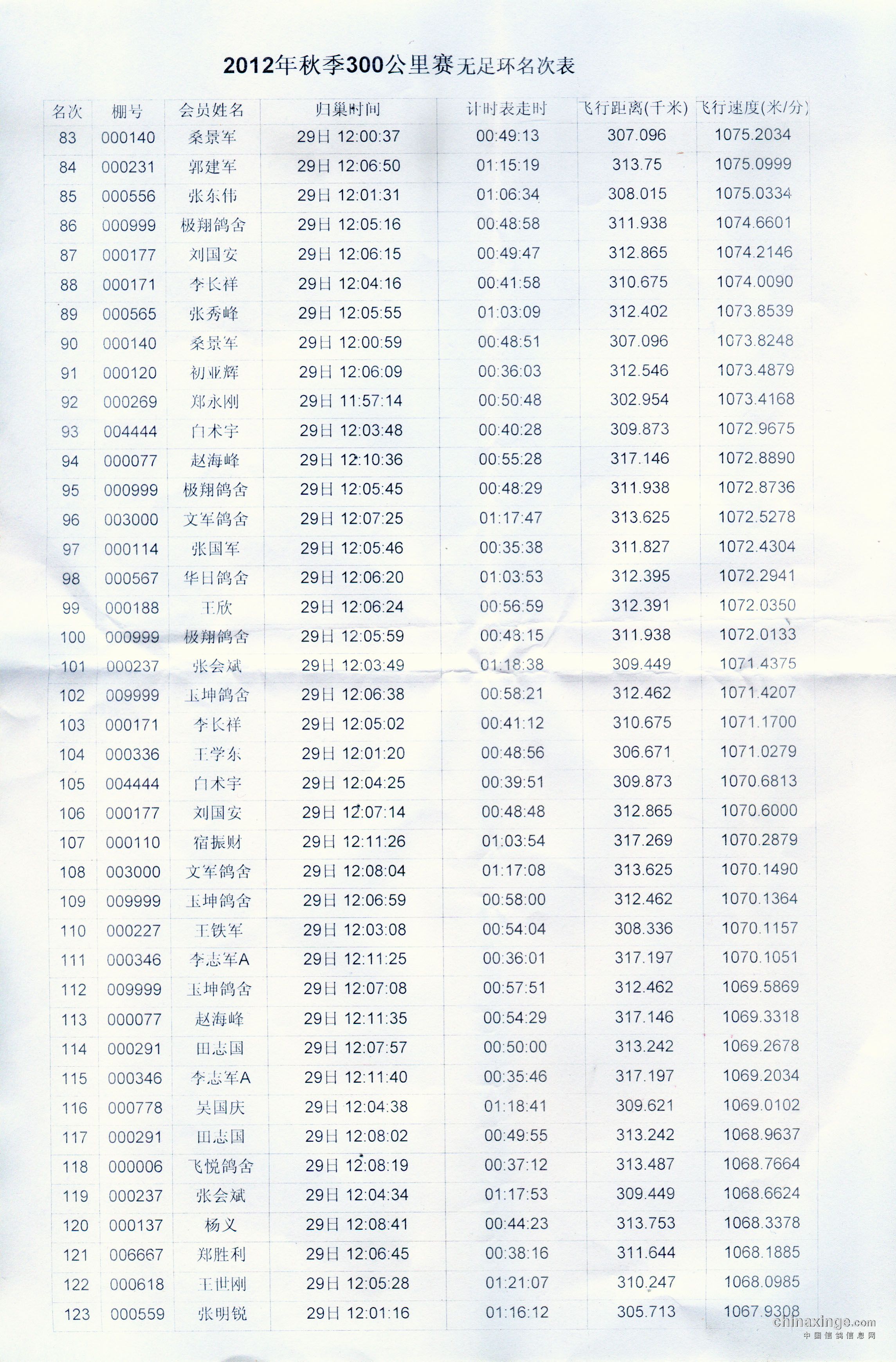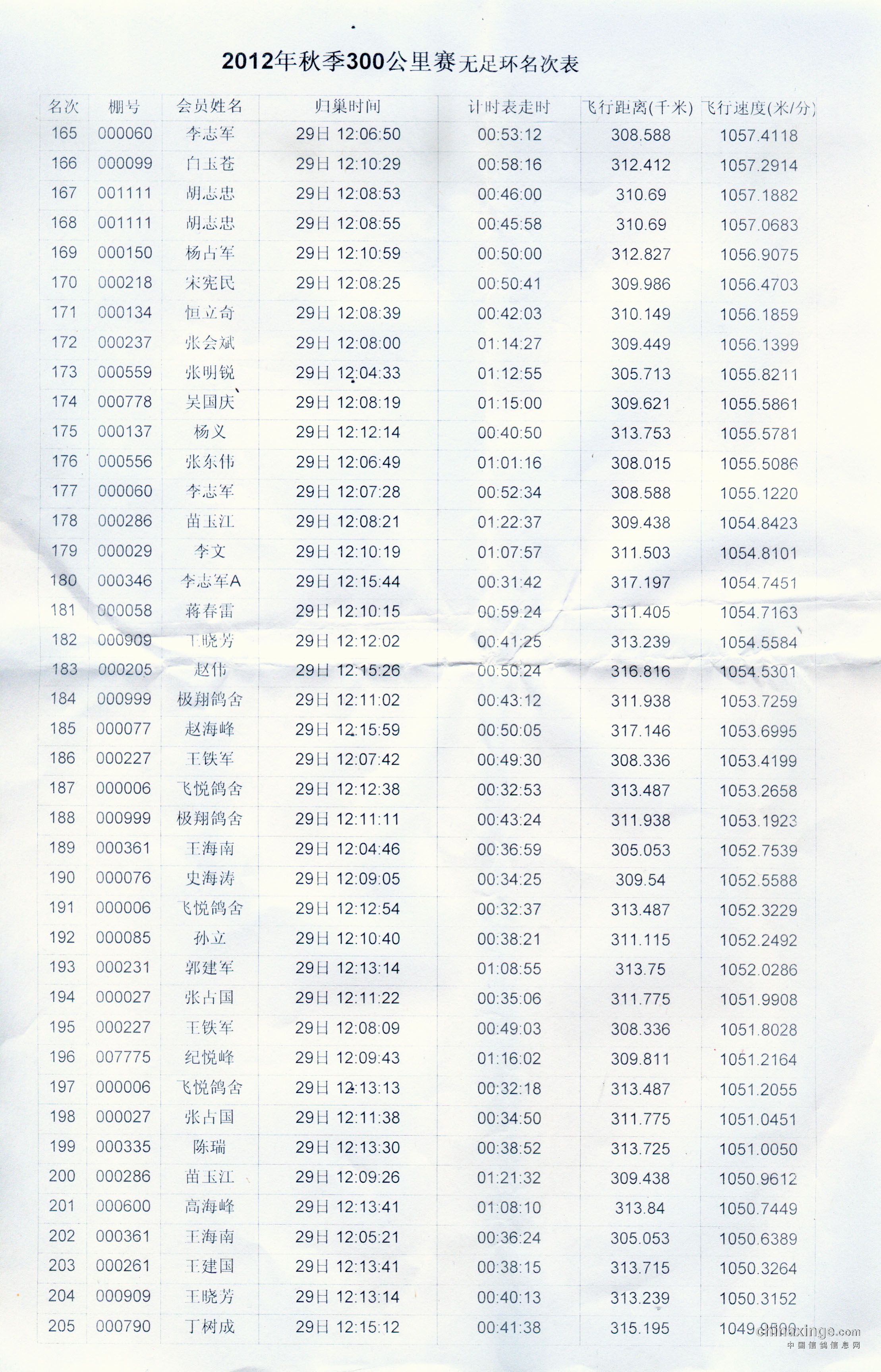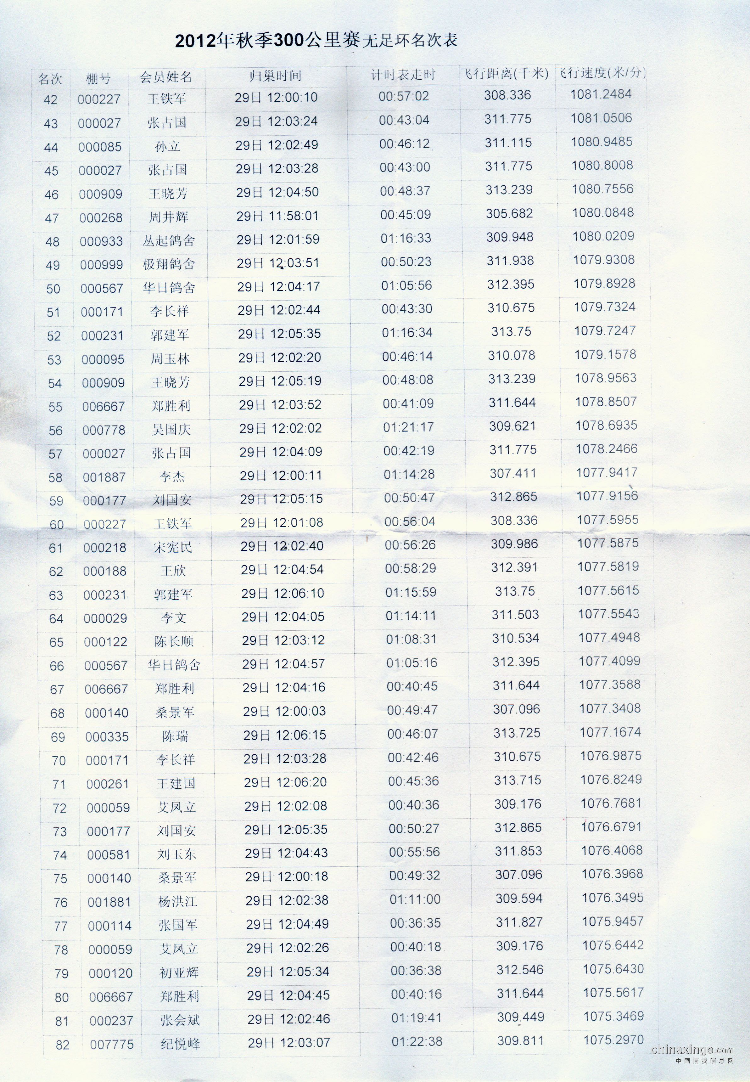 赤峰市红山区信鸽协会2012年秋季300公里成绩单