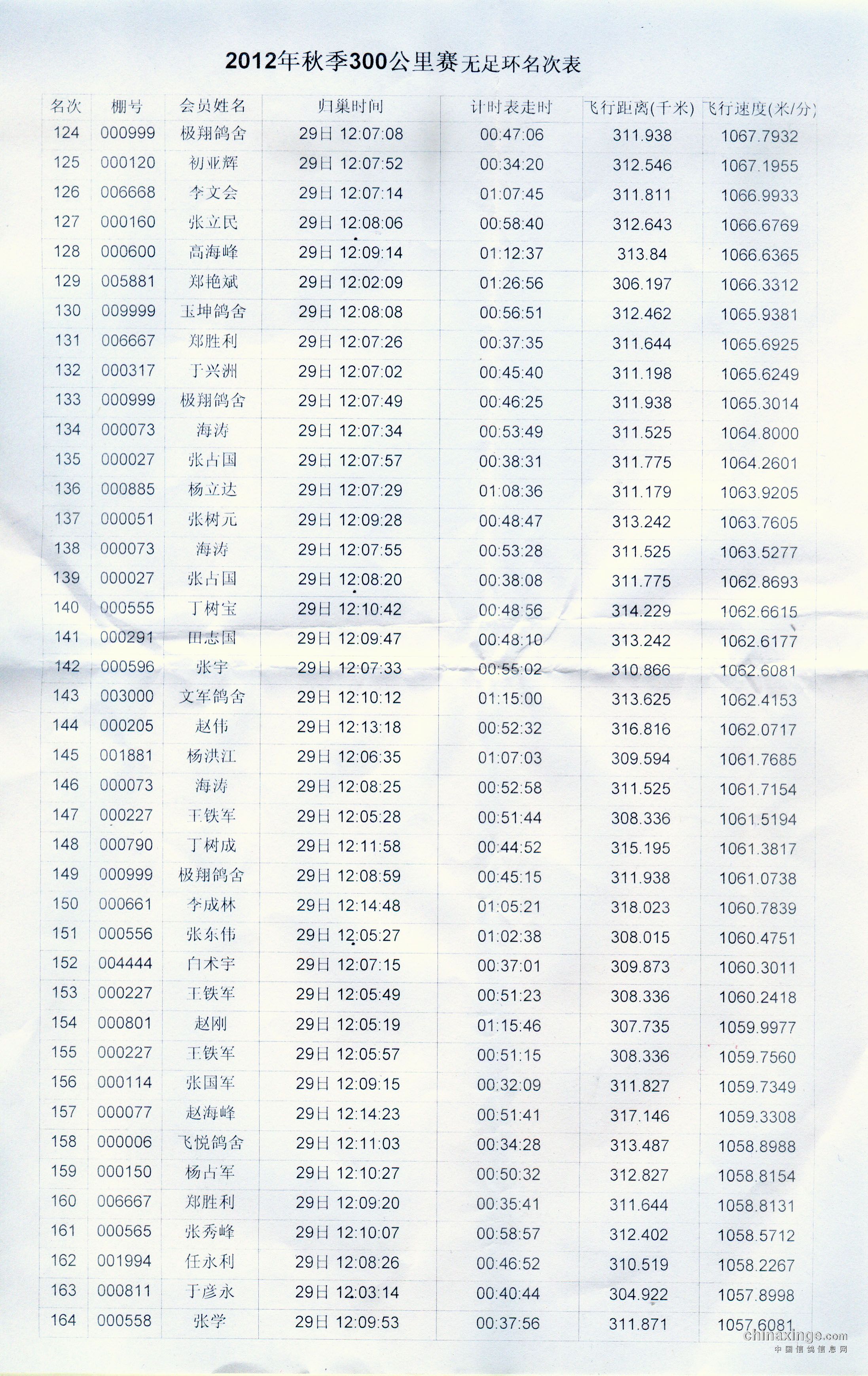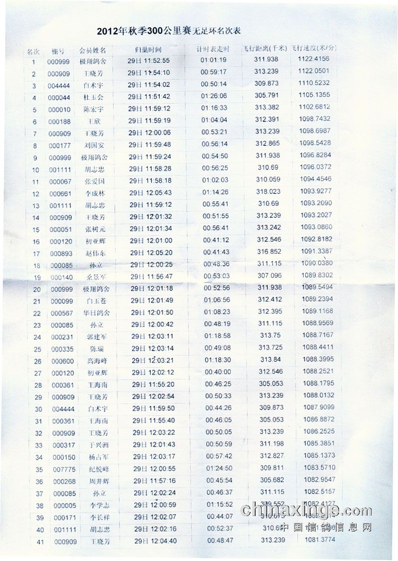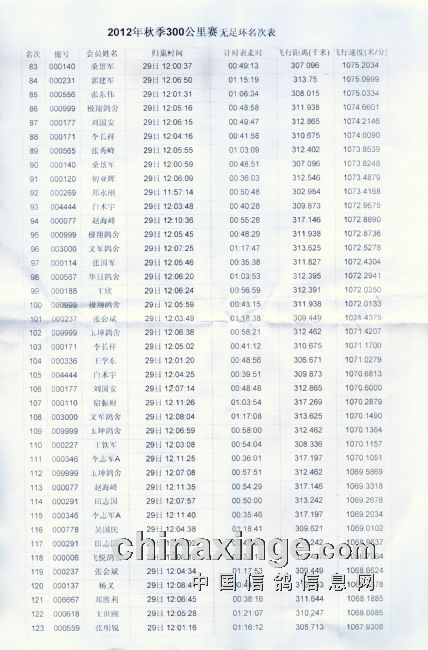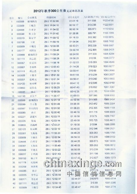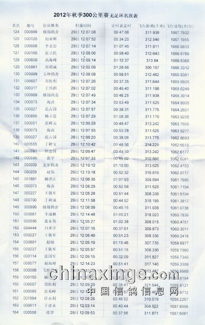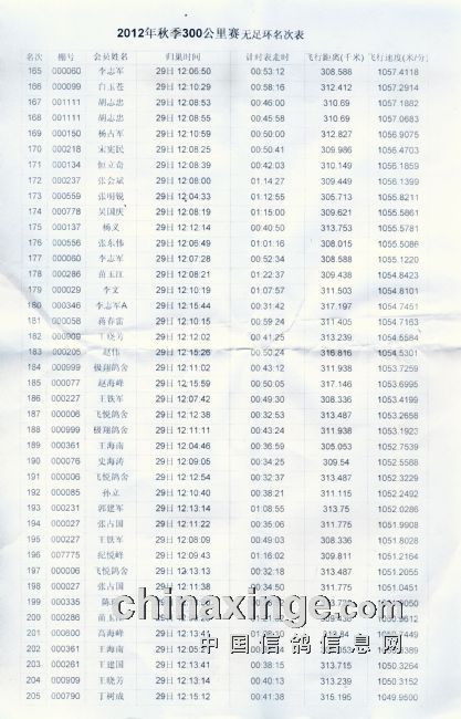 赤峰市红山区信鸽协会2012年秋季300公里成绩单