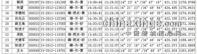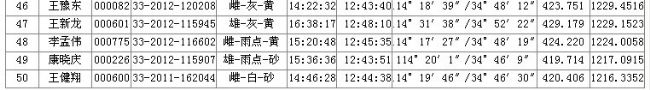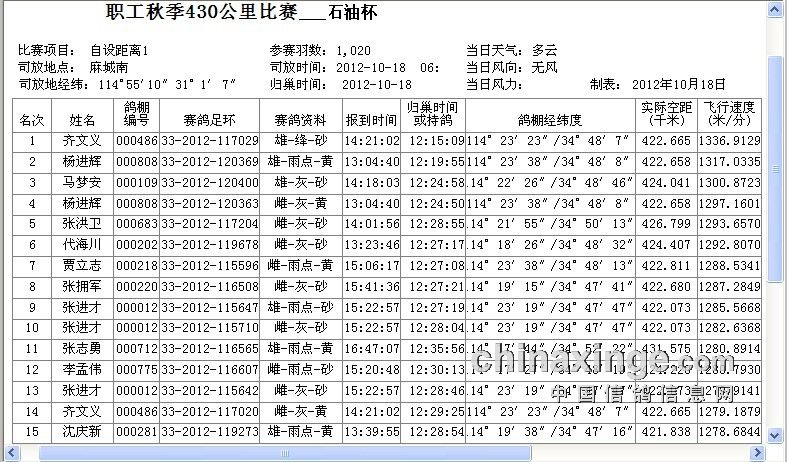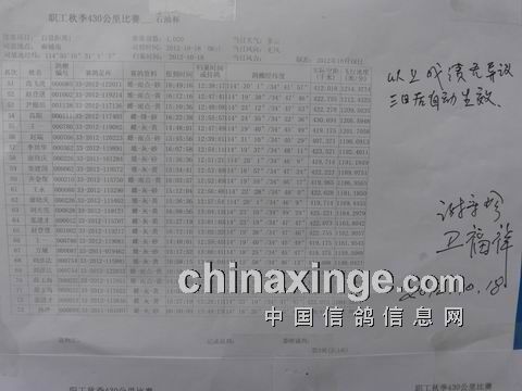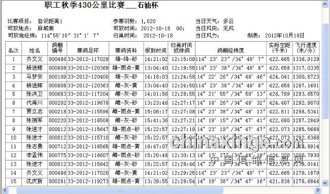 职工信鸽协会2012年秋季430公里石油杯成绩
