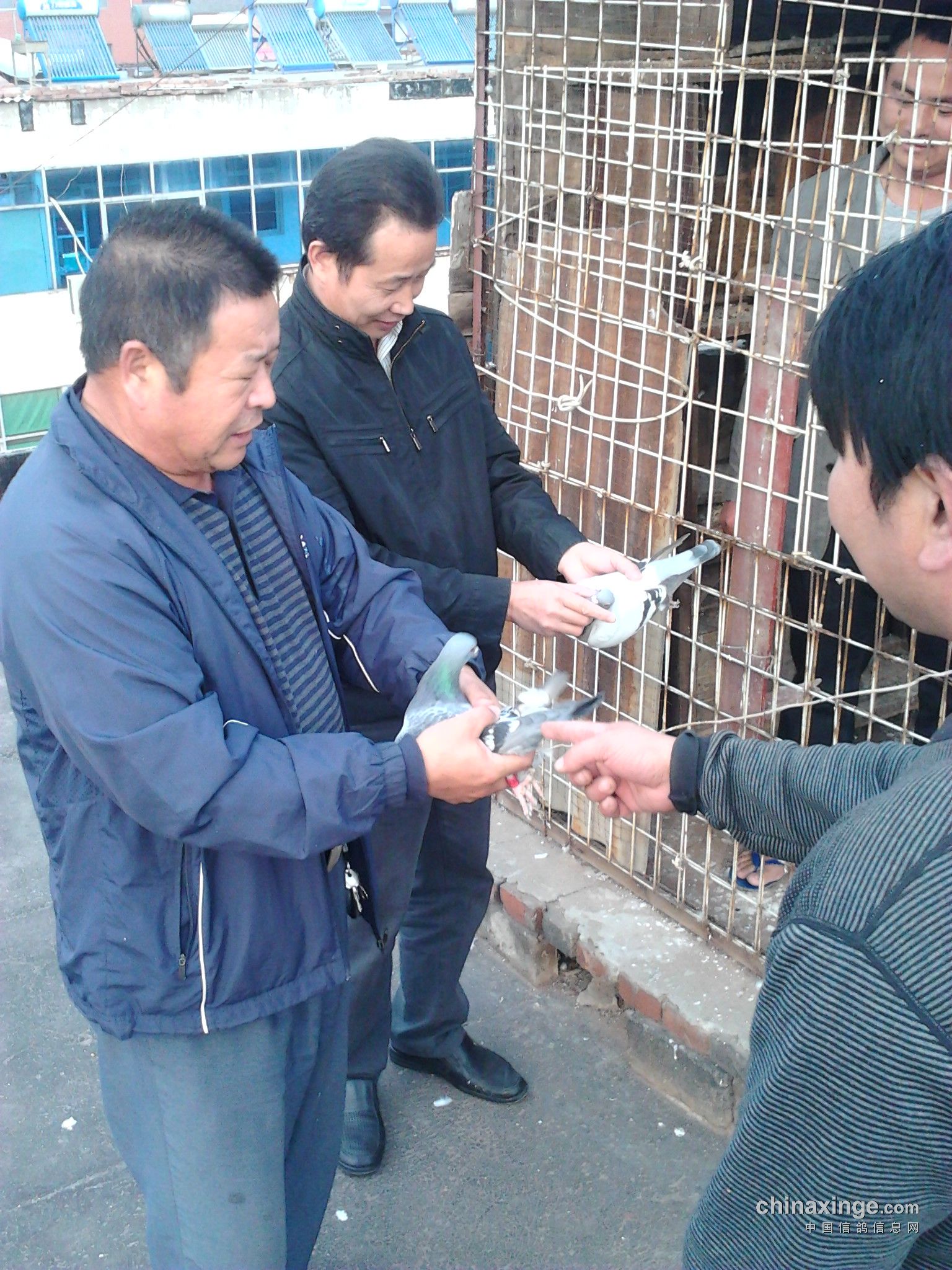 有会员代表,朱周星、郭艺辉、小峰在第一只报道会员魏迎飞鸽舍验棚。