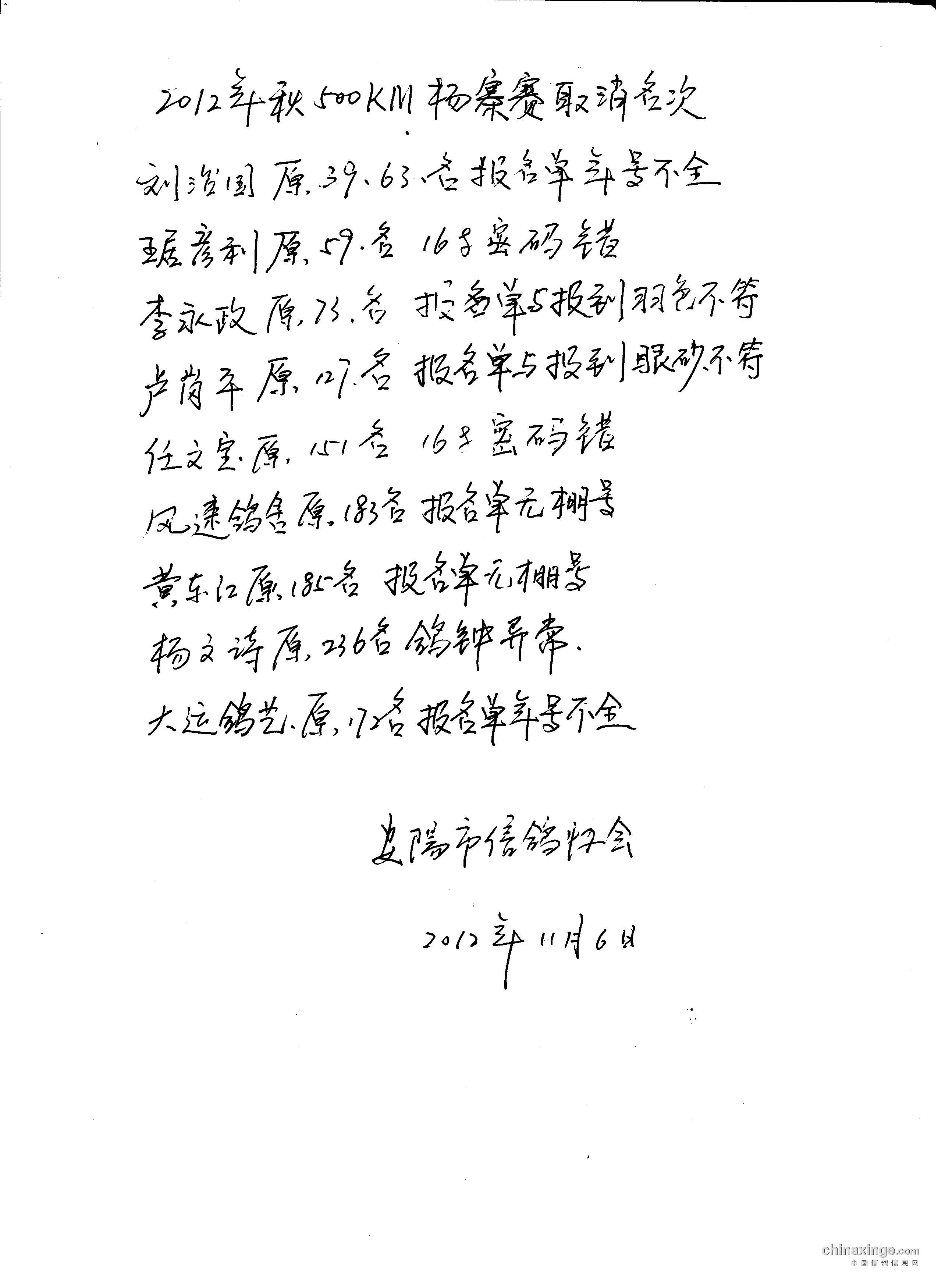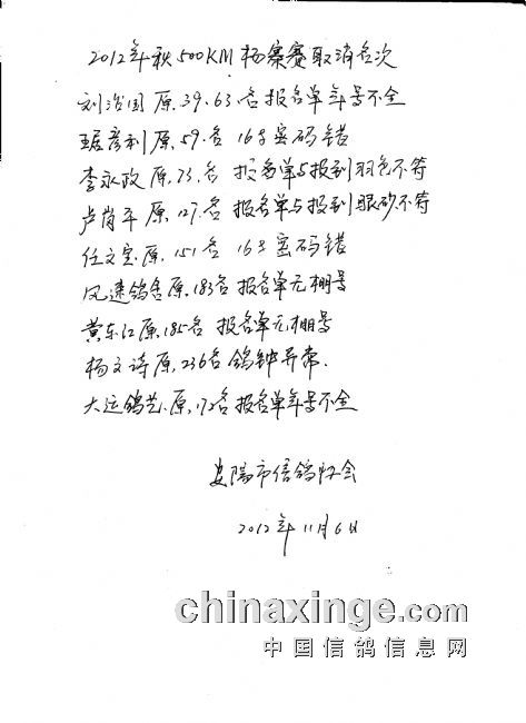 备注:以上为500公里杨寨取消成绩,如有异议请24小时内与协会联系。如无异议24小时此成绩生效。联系电话:15537237553