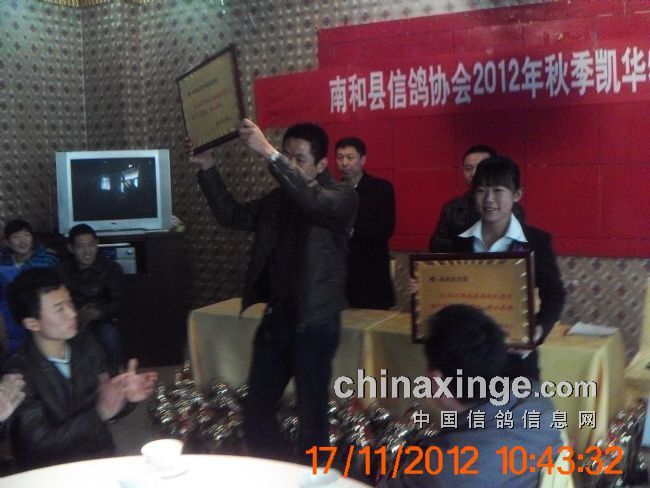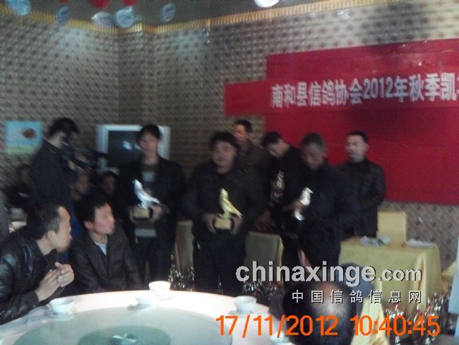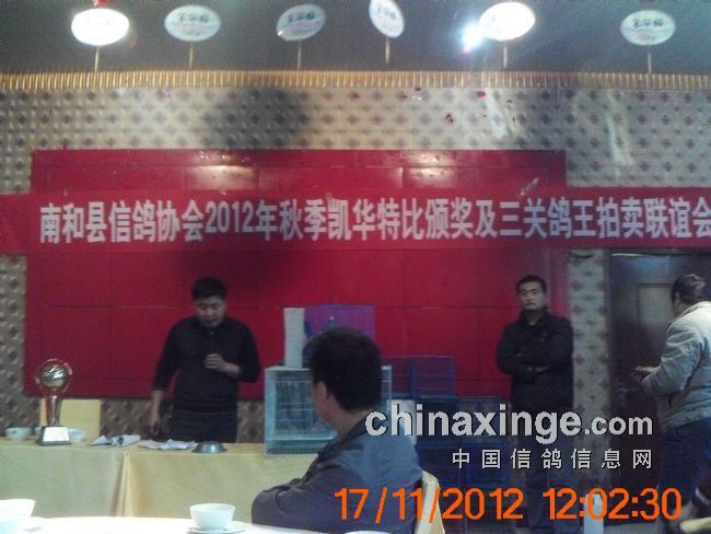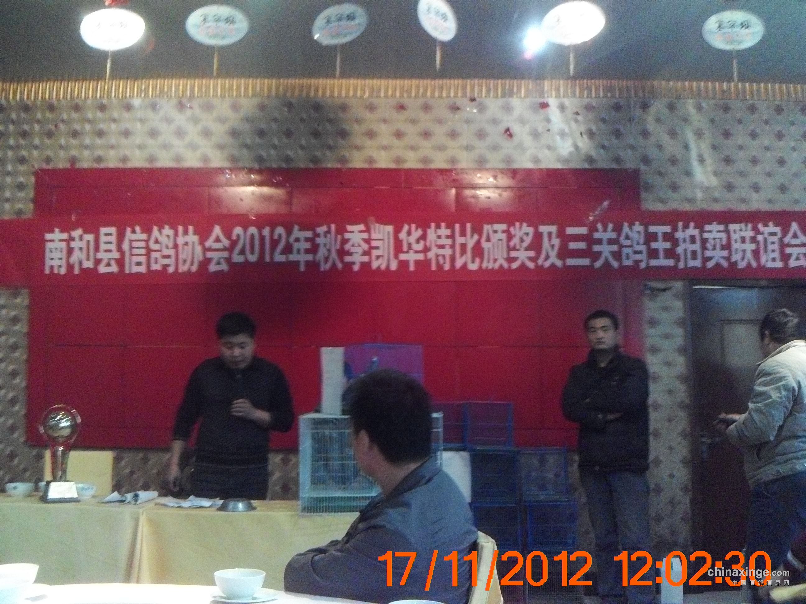 2012年南和鸽会秋季特比赛颁奖及三关鸽王拍卖联谊会在南和县宾馆举行,非常荣幸:南和县文广新体局领导以及凯华通讯商场的老总,到现场为获奖鸽友颁奖。今天到会鸽友130多人,大家热情高涨,20羽鸽王,无一羽流拍,今天最高竞拍价以2500元成交。再次感谢广大鸽友对本协会的厚爱,以下是今天拍卖现场照片: