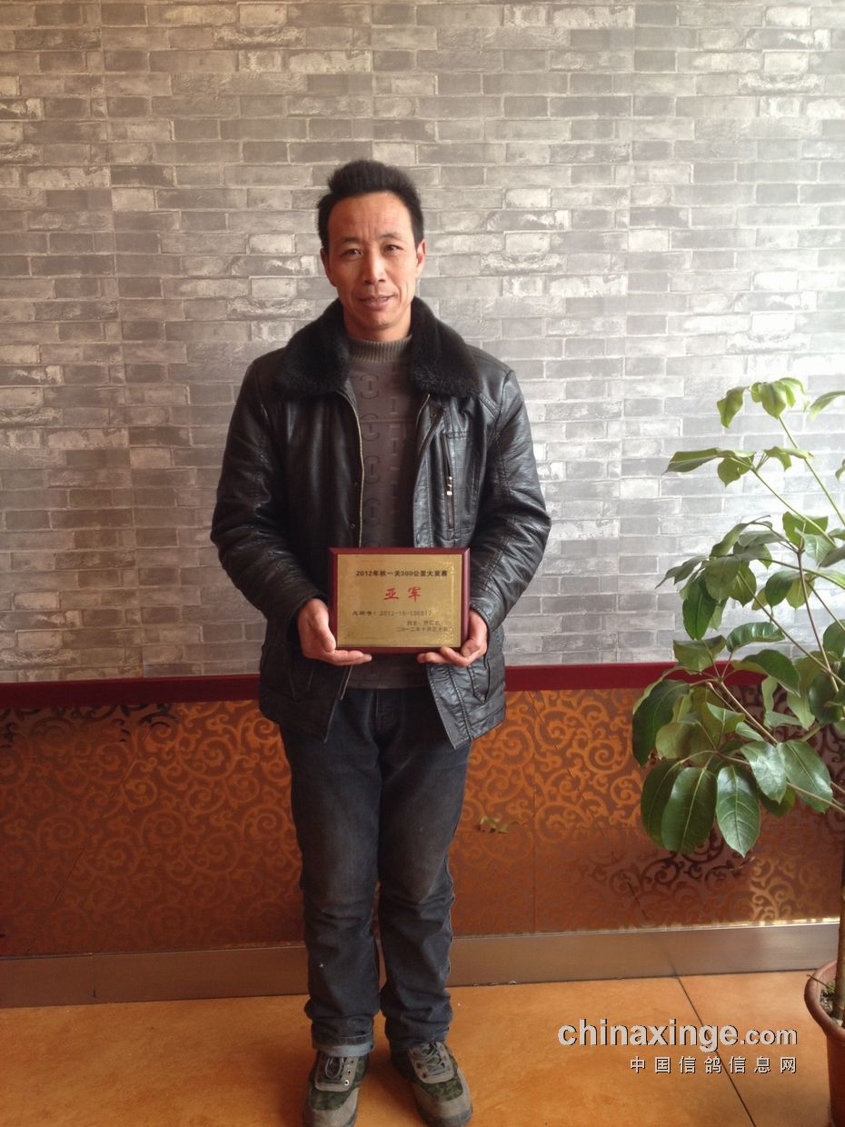2012年秋季300、300、500公里三关鸽王综合排名亚军、10名,一关300公里大奖赛季军。 鸽主:许广旭 13598486388