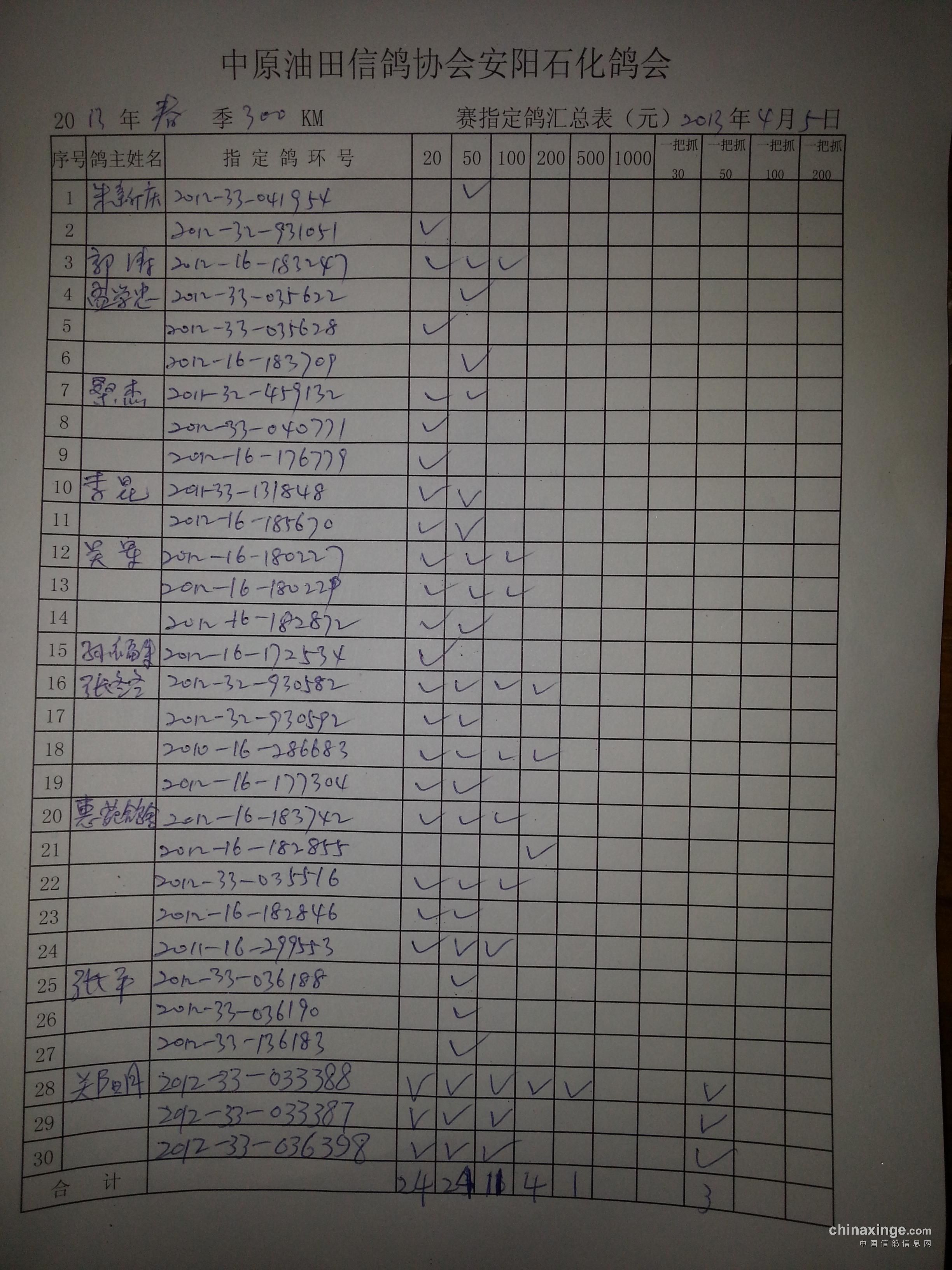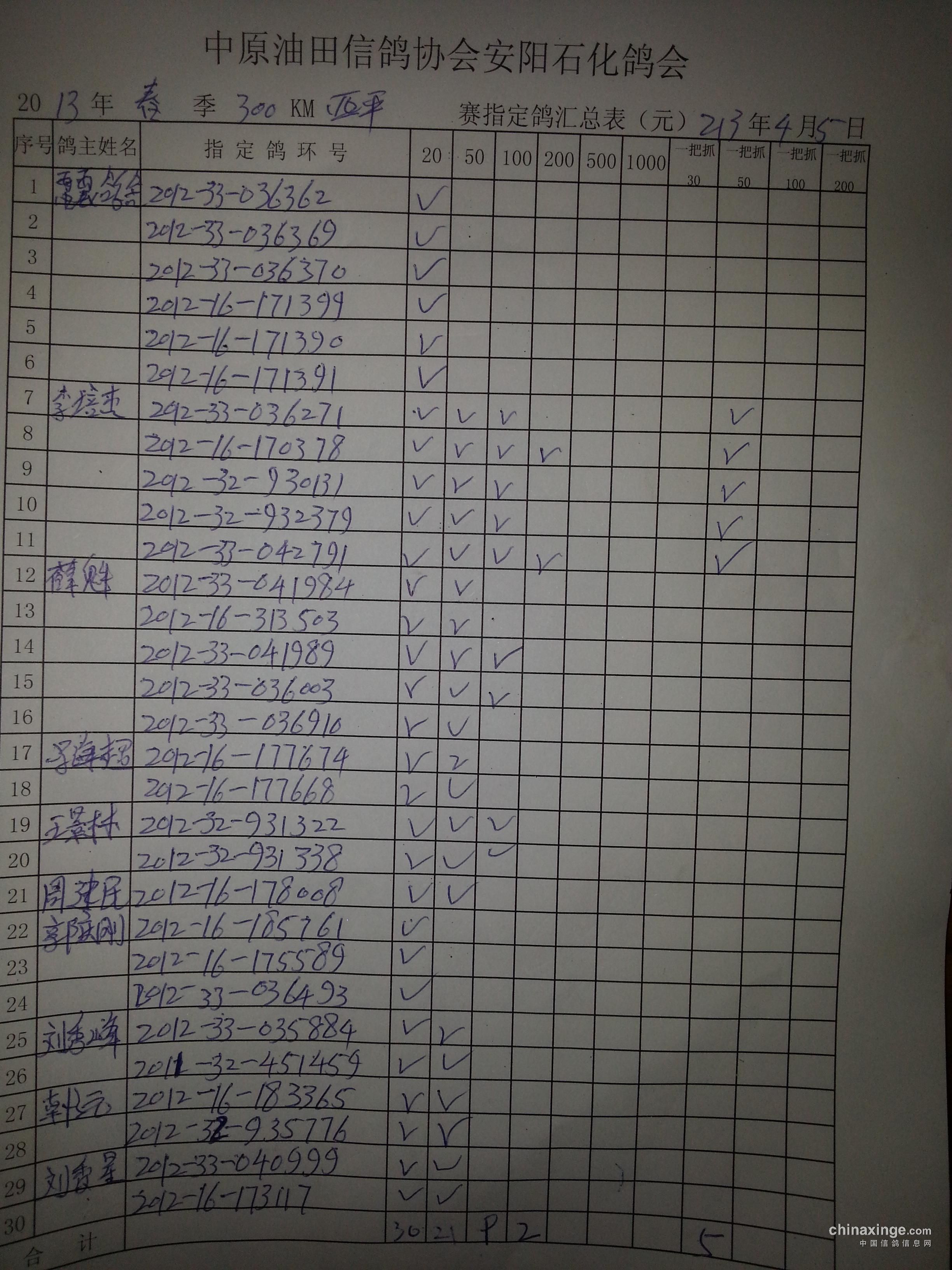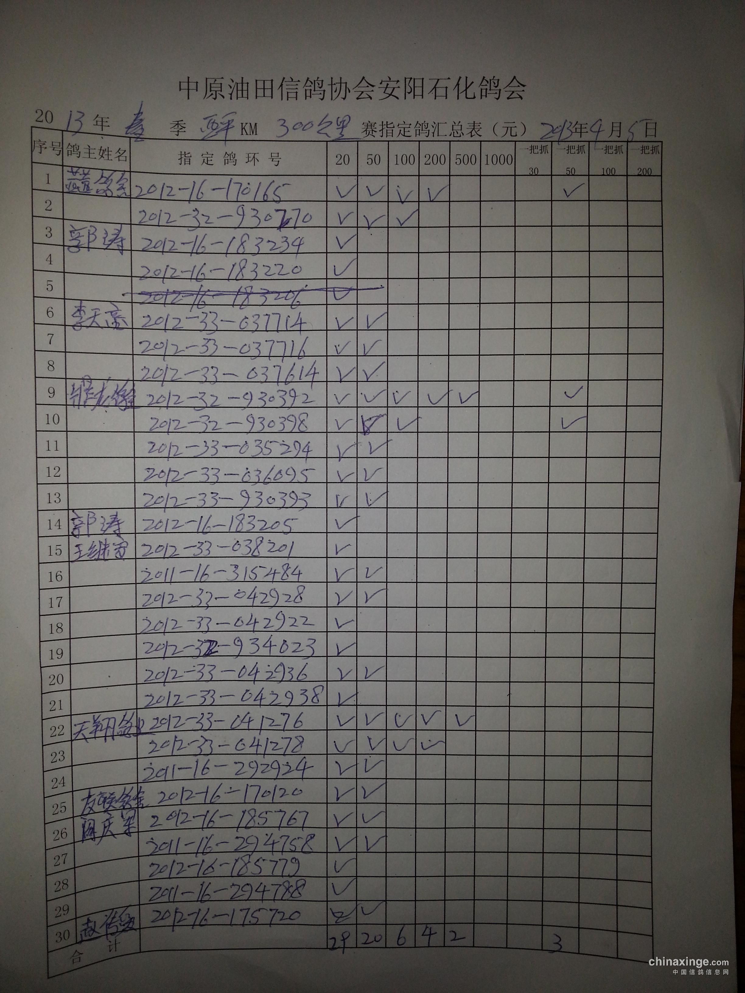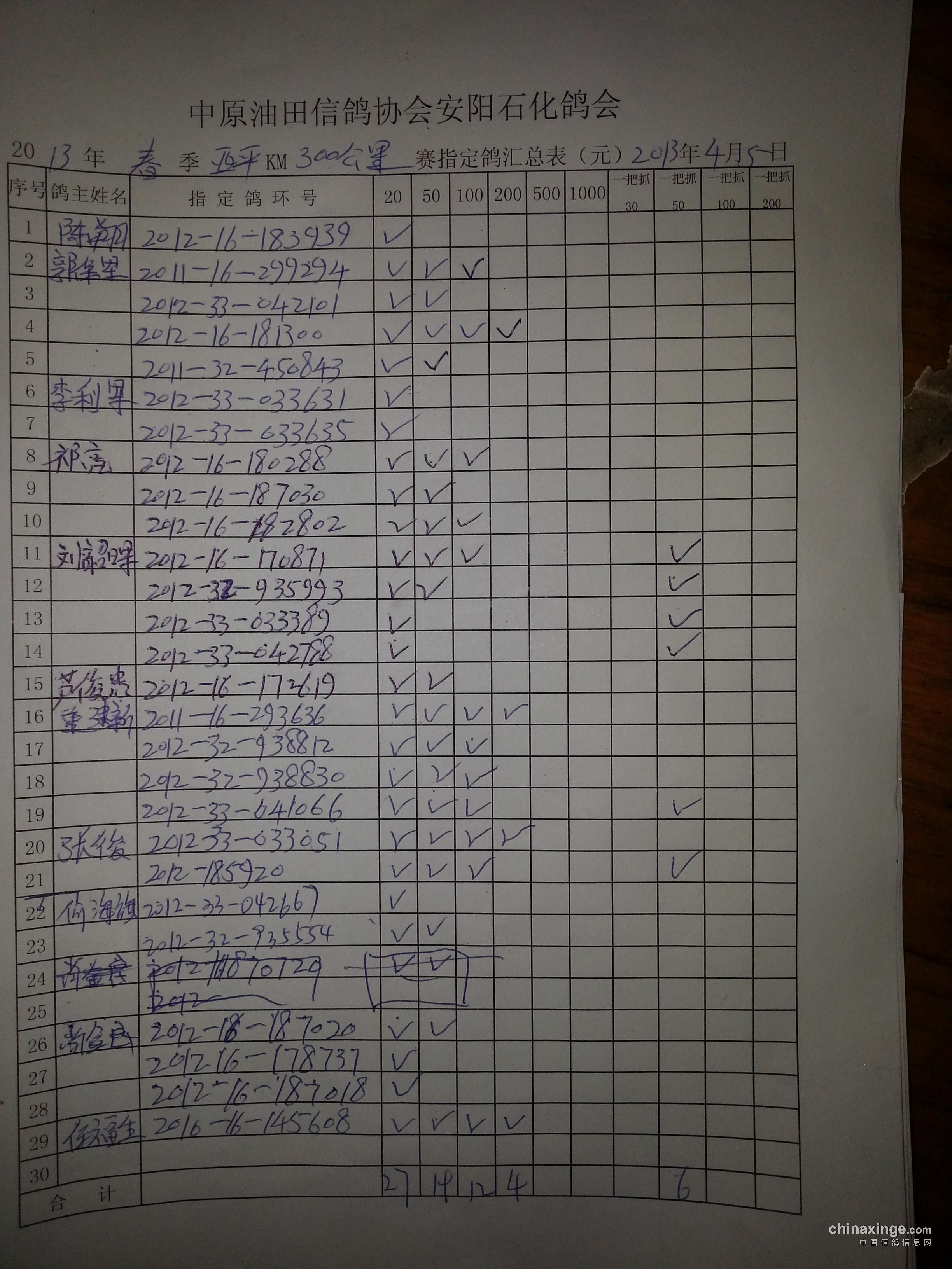 2013年春季“科汇杯”300公里指定鸽及“南方家具杯”参赛卡明细