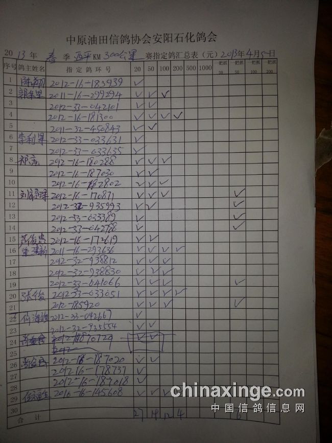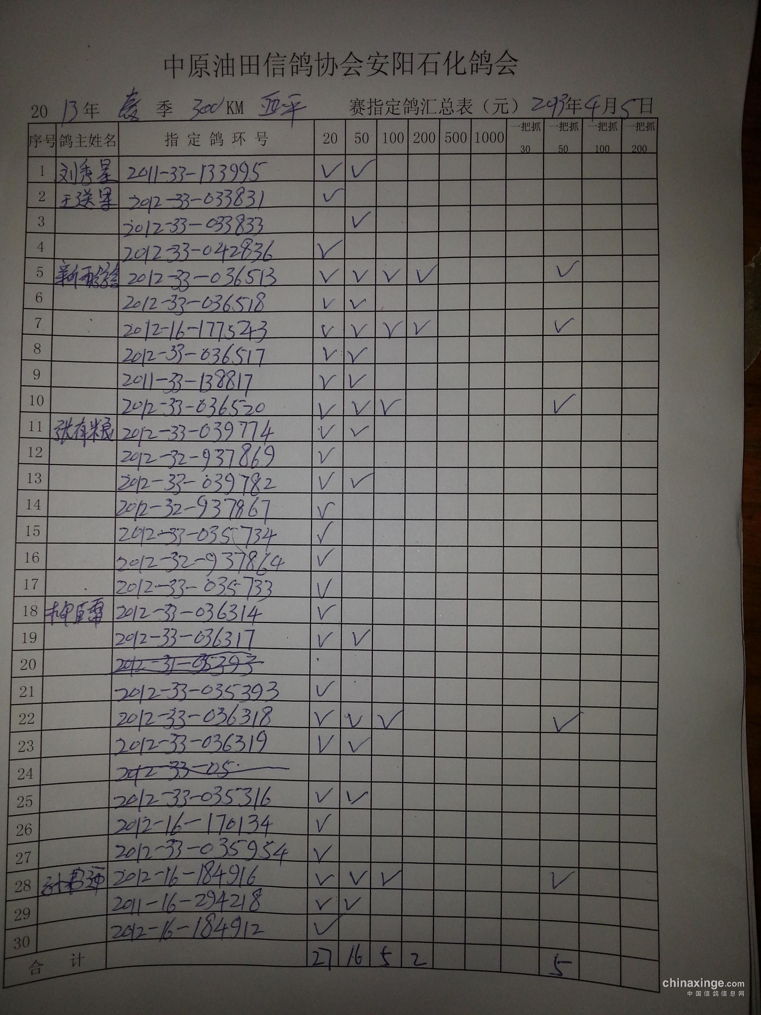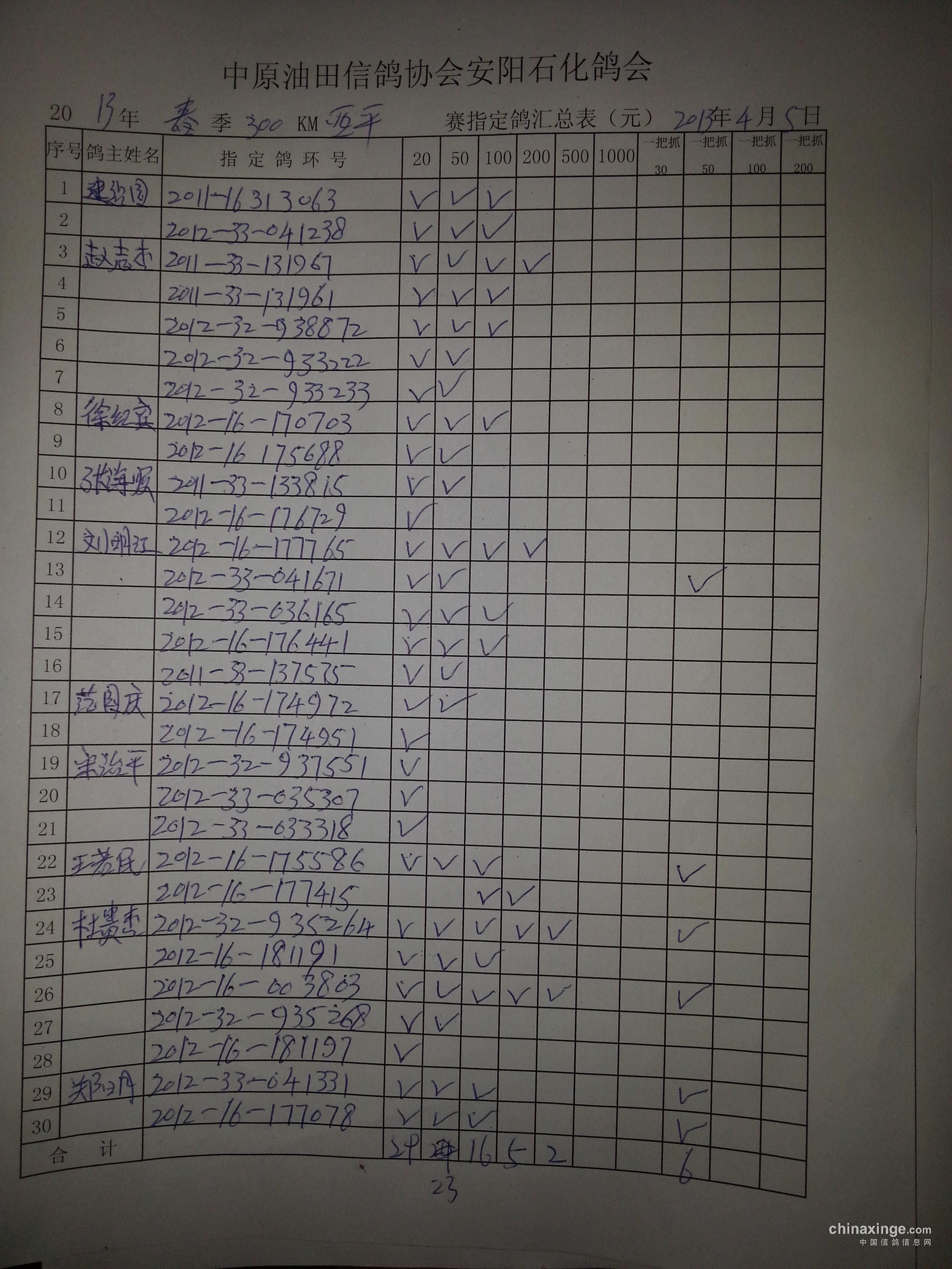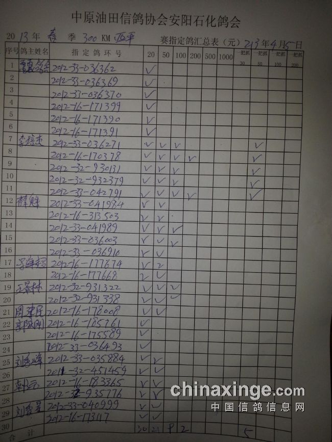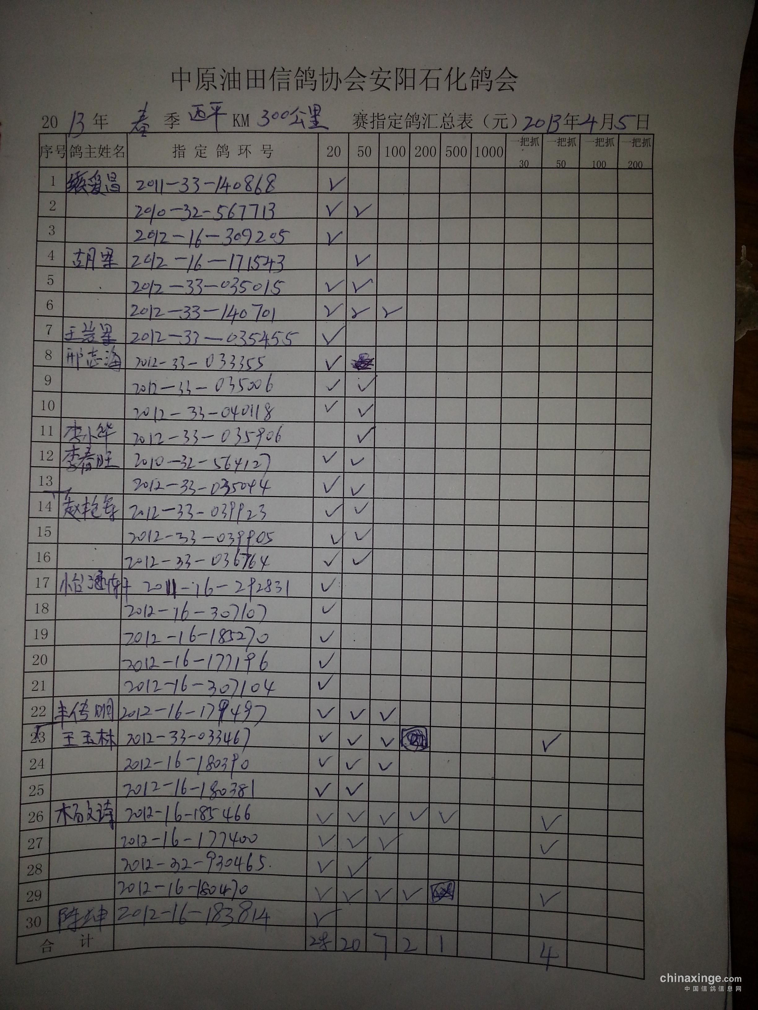 2013年春季“科汇杯”300公里指定鸽及“南方家具杯”参赛卡明细