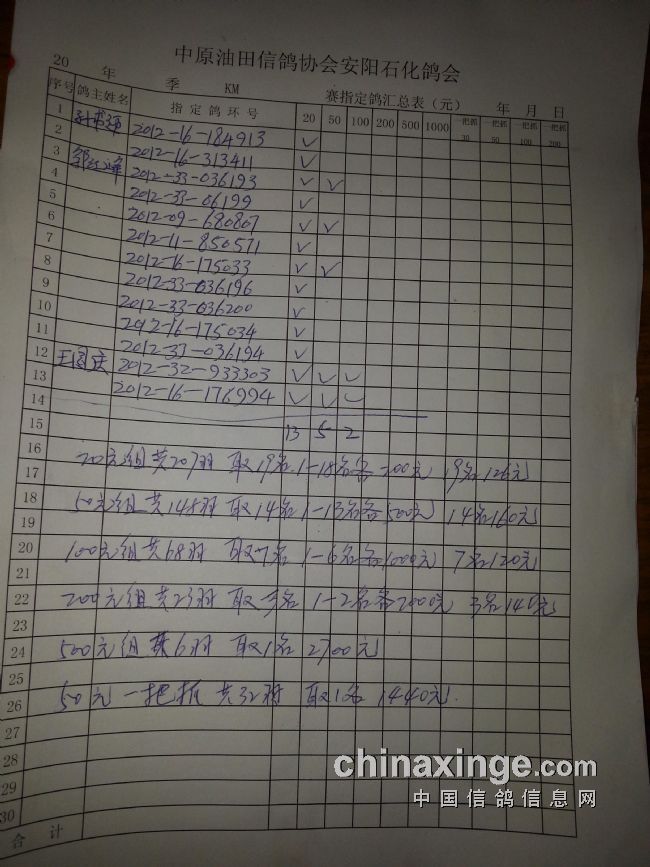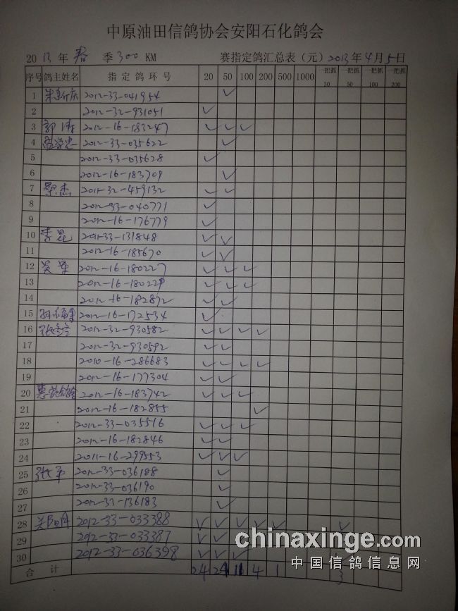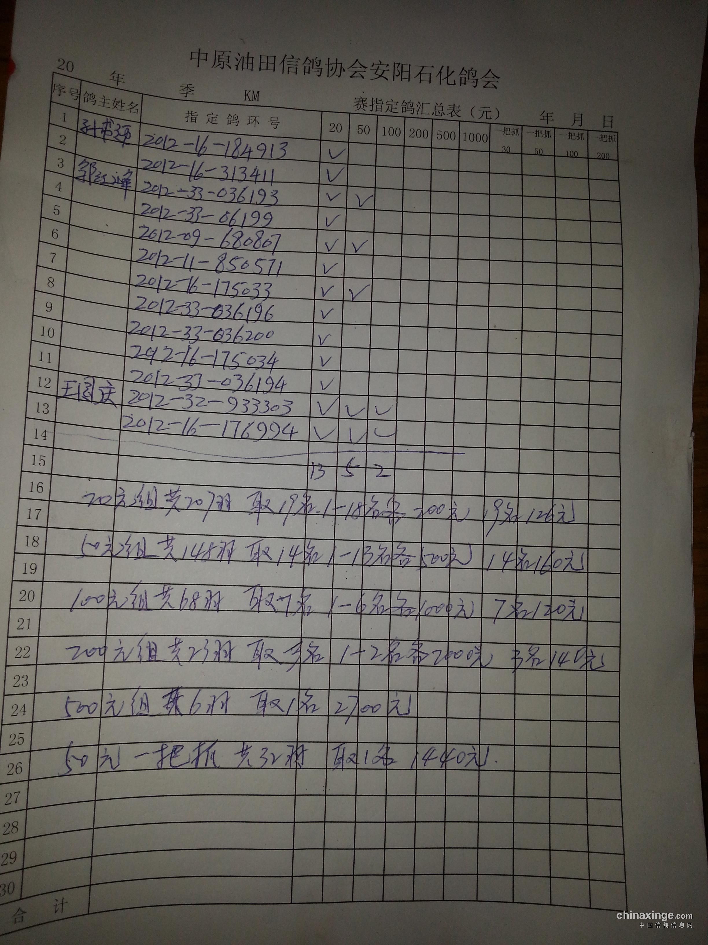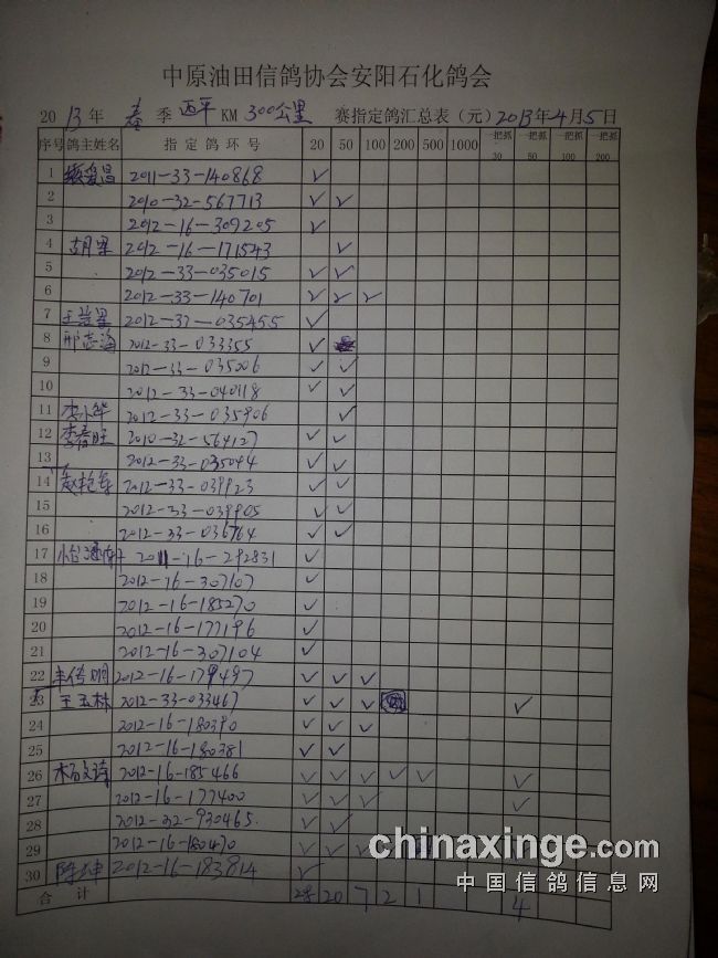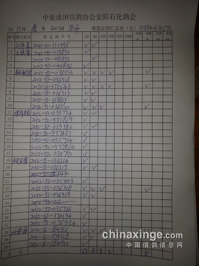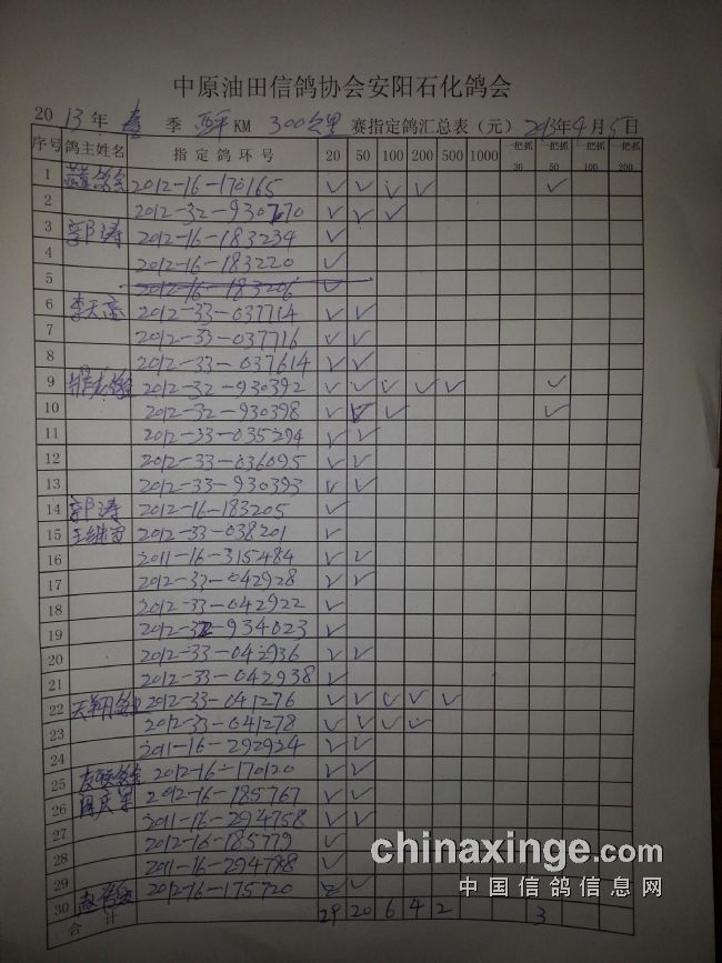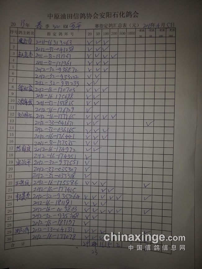 2013年春季“科汇杯”300公里指定鸽及“南方家具杯”参赛卡明细