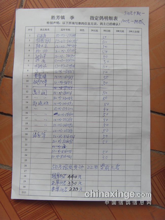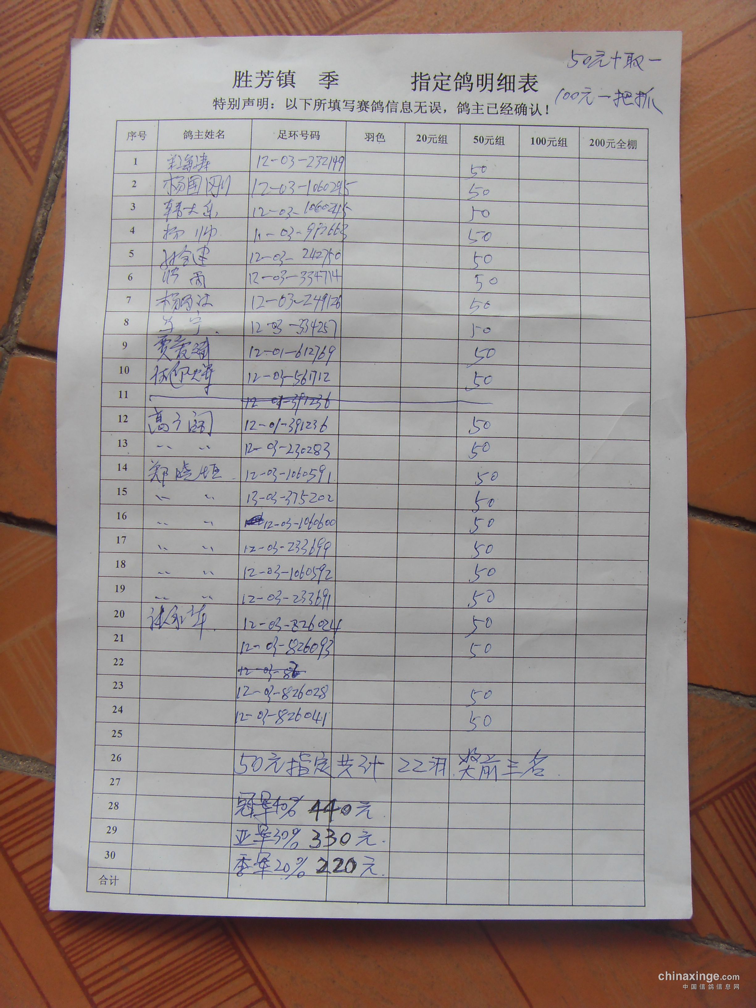 冠军11 张永华 12-03-826093 雌 雨点 牛 112.898 1103.5980 亚军25 张永华 12-03-826028 雌 花绛 牛 112.898 1059.5784 季军26 杨丙江 12-03-249126 雄 雨点 黄 145.664 1046.8160