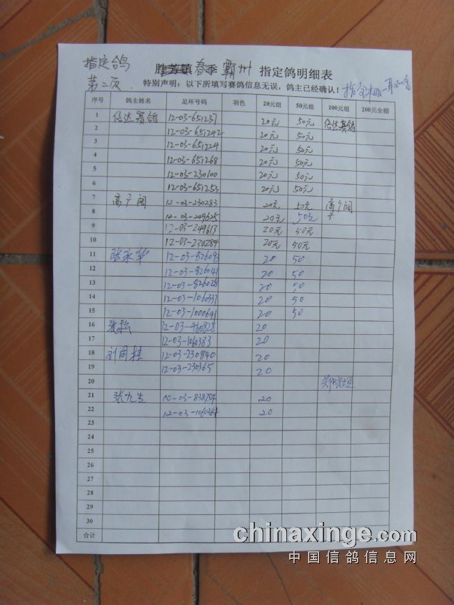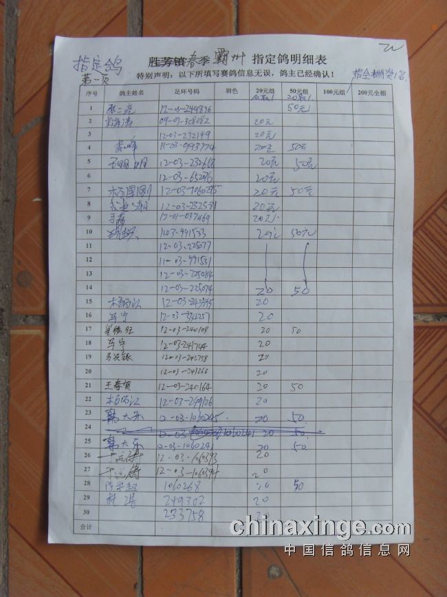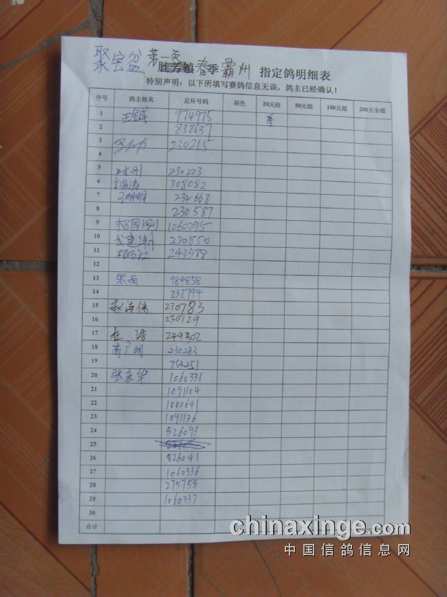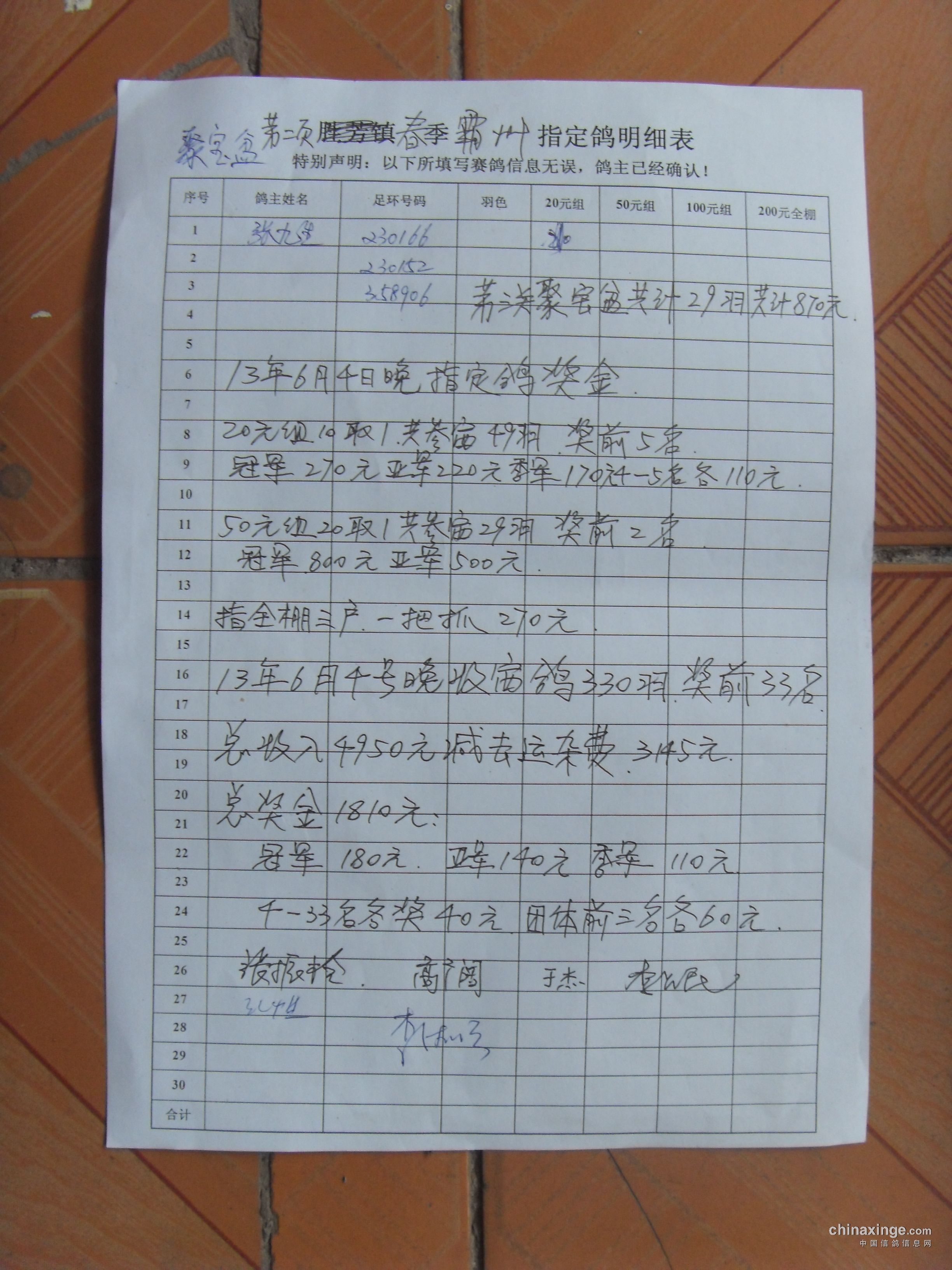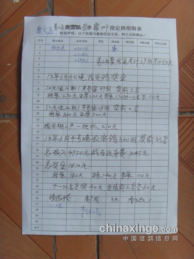 霸州鸽会13年6月5日365公里比赛指定鸽原始照片.与奖金分配