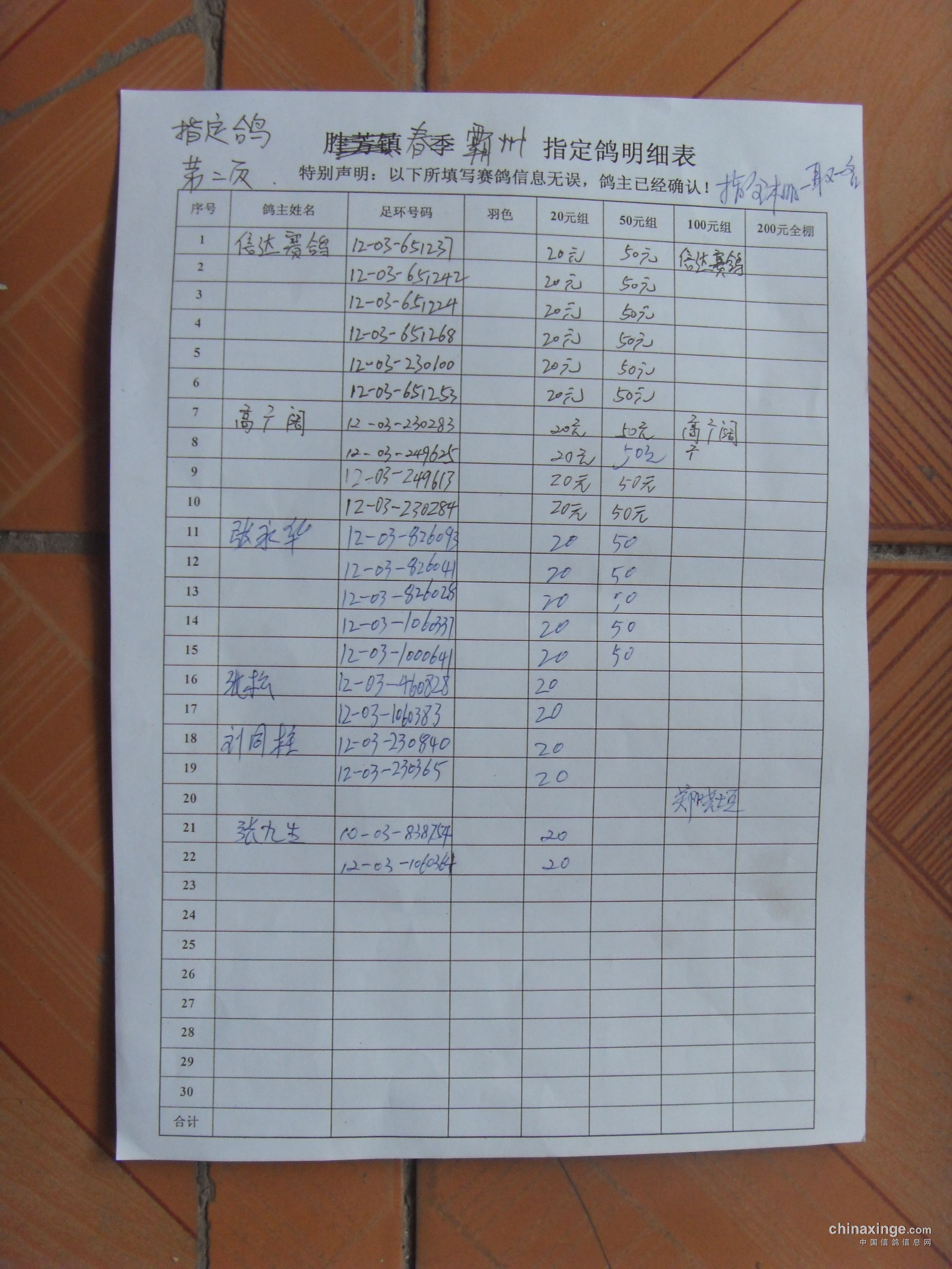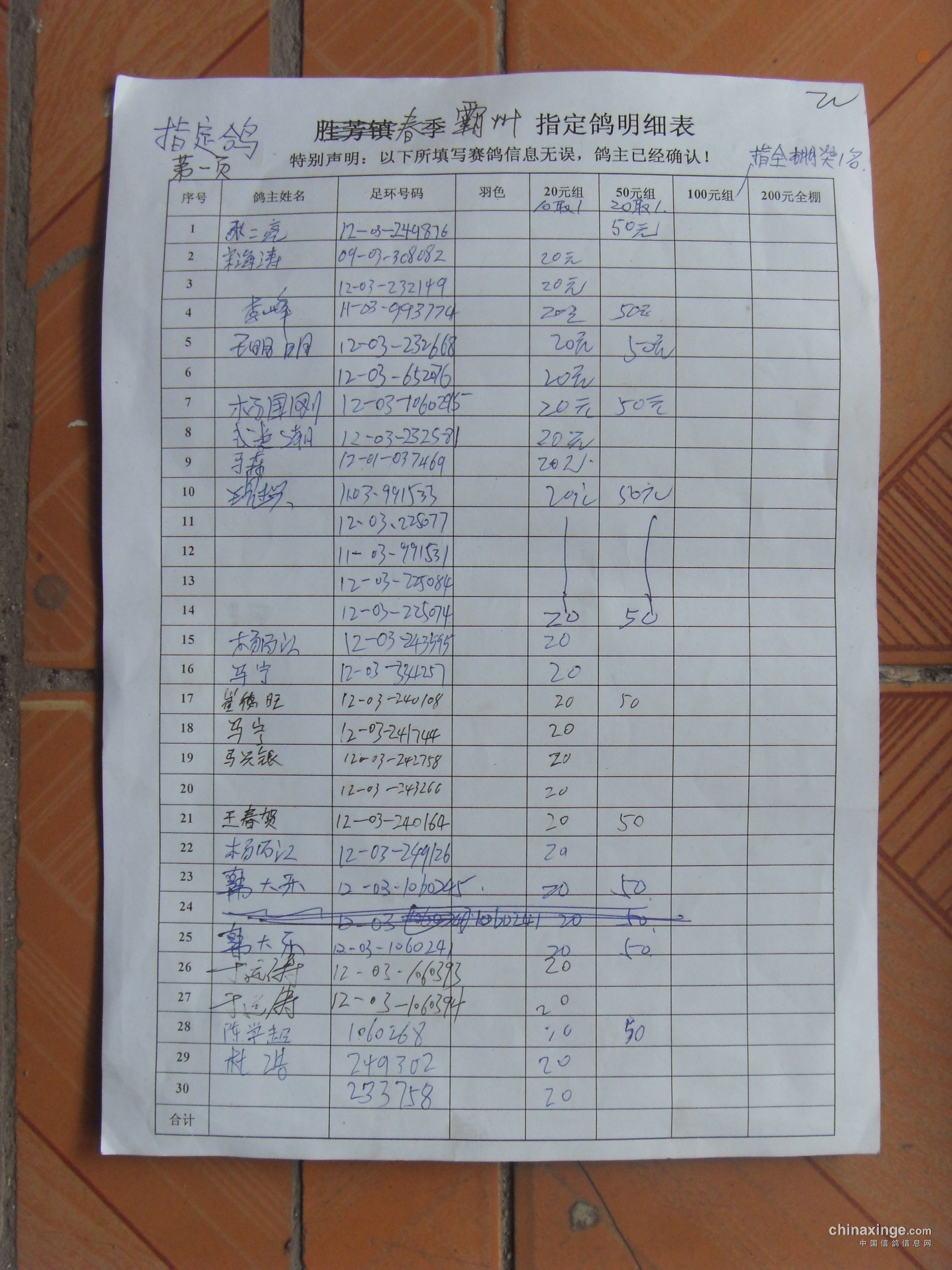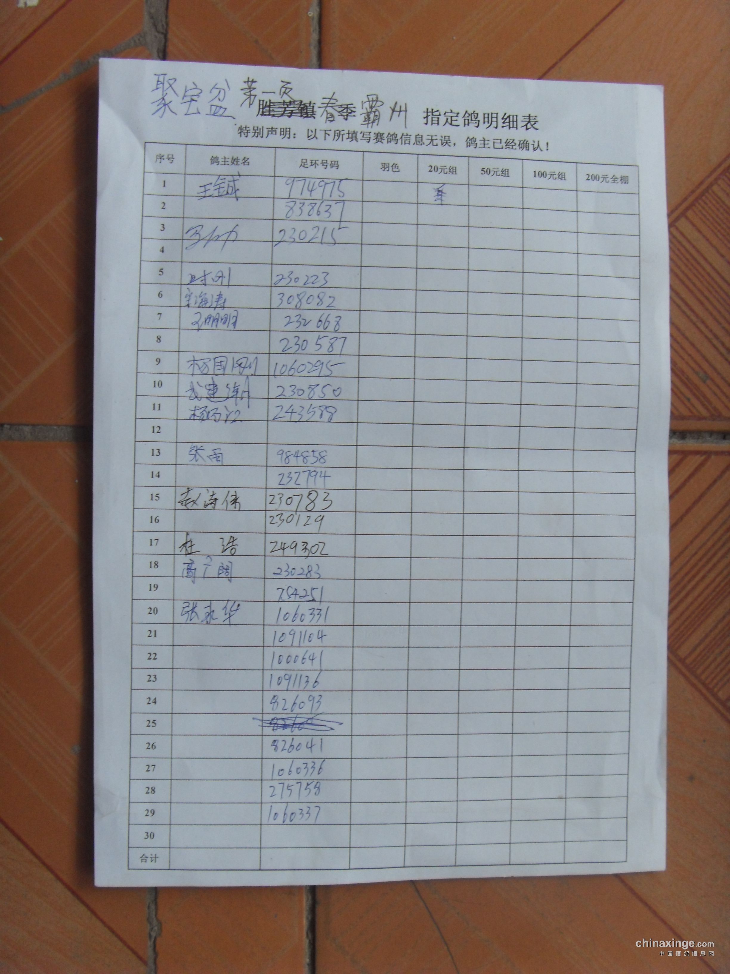 霸州鸽会13年6月5日365公里比赛指定鸽原始照片.与奖金分配