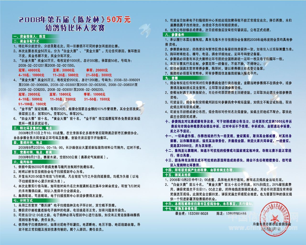 2008年第五届《陈龙杯》50万元幼鸽特比环大奖赛规程