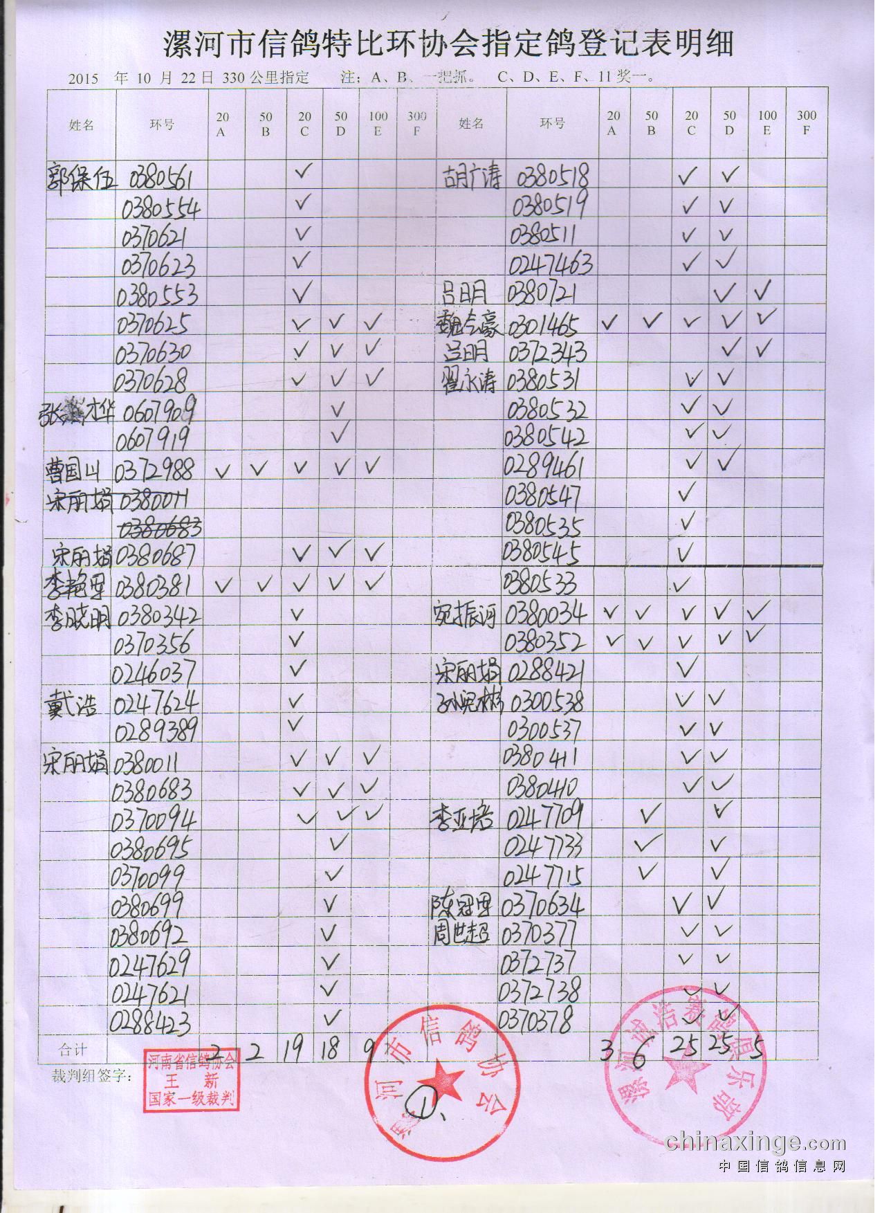 漯河市信鸽协会2019年秋季420公里内丘上笼清单