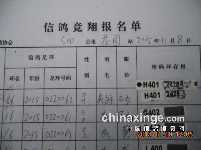 2015秋540公里花园站普赛7名、特比季军任伟验鸽图片