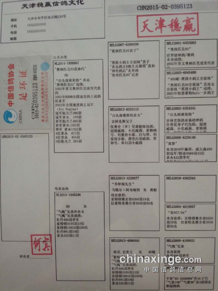 天津稳赢鸽业何宾先生赞助第十一名奖鸽