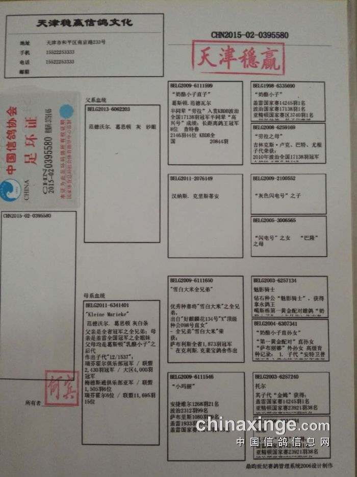 天津稳赢鸽业何宾先生赞助第二十七名奖鸽