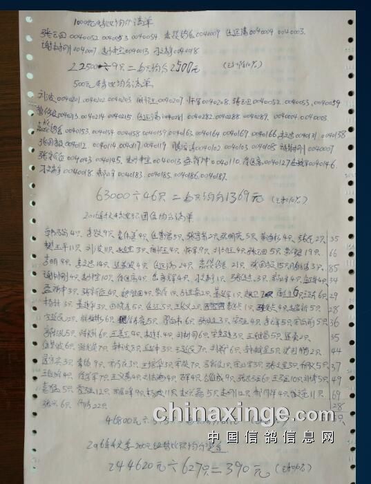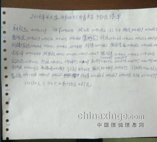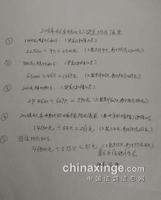 章丘市信鸽协会2016年秋季特比环奖金均分清单