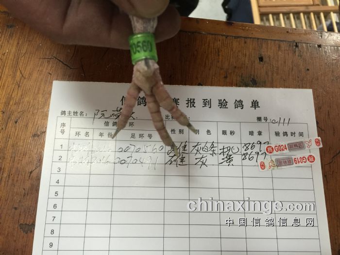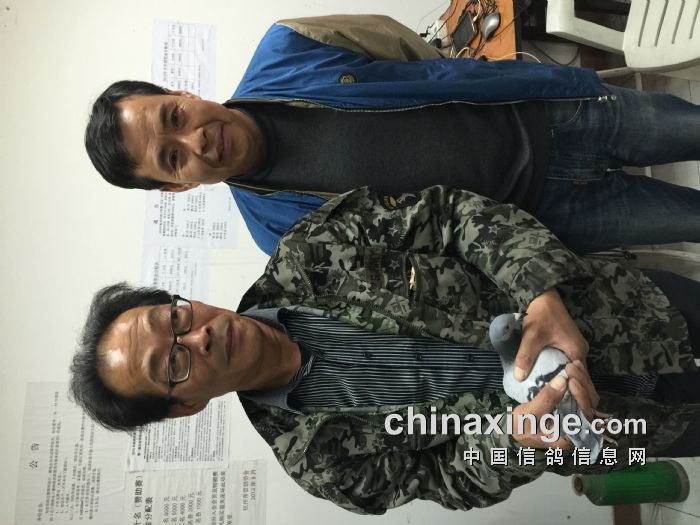 冠军鸽主阮荣庆,外市台州市信鸽协会秘书长国家一级裁判陈钢先生监督比赛验鸽。