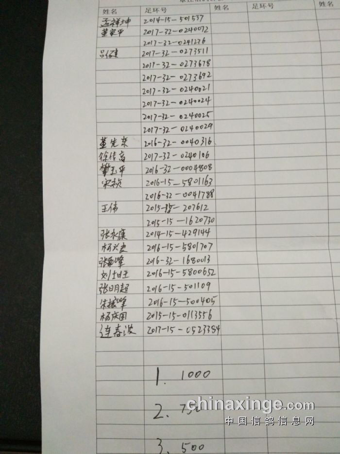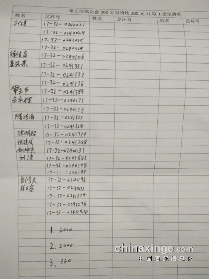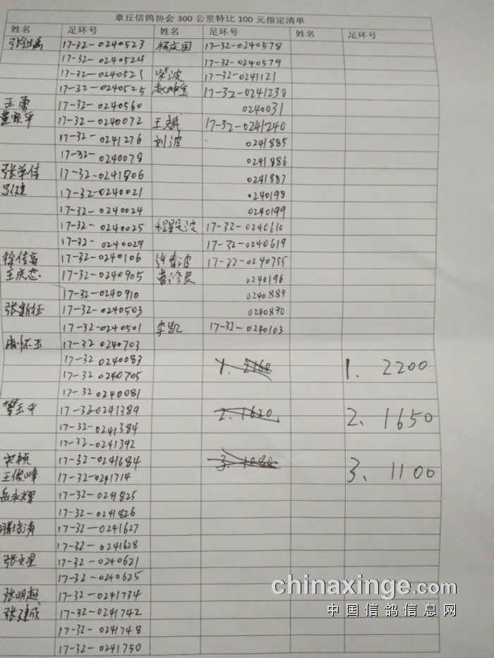 章丘区信鸽协会2023秋特比环双关综合成绩