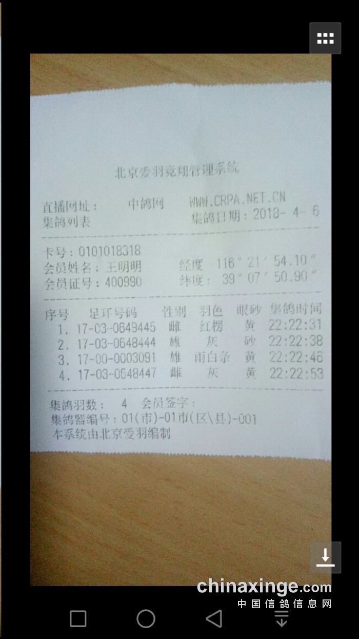 鸽友王明明的四羽赛鸽由于集鸽人员工作疏忽没有加盖暗章,特此公示四羽赛鸽环号如图。