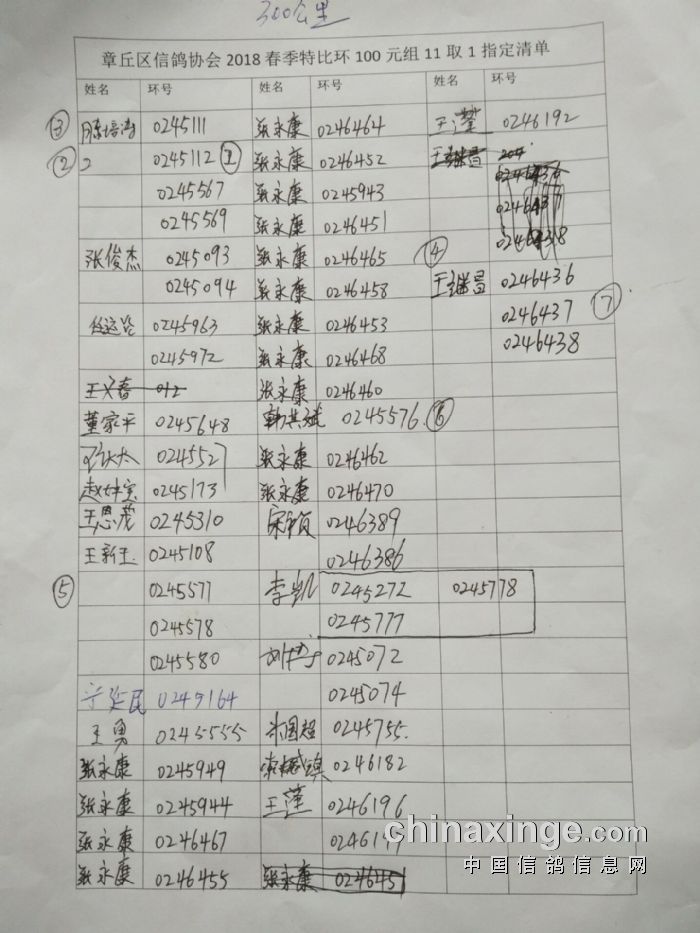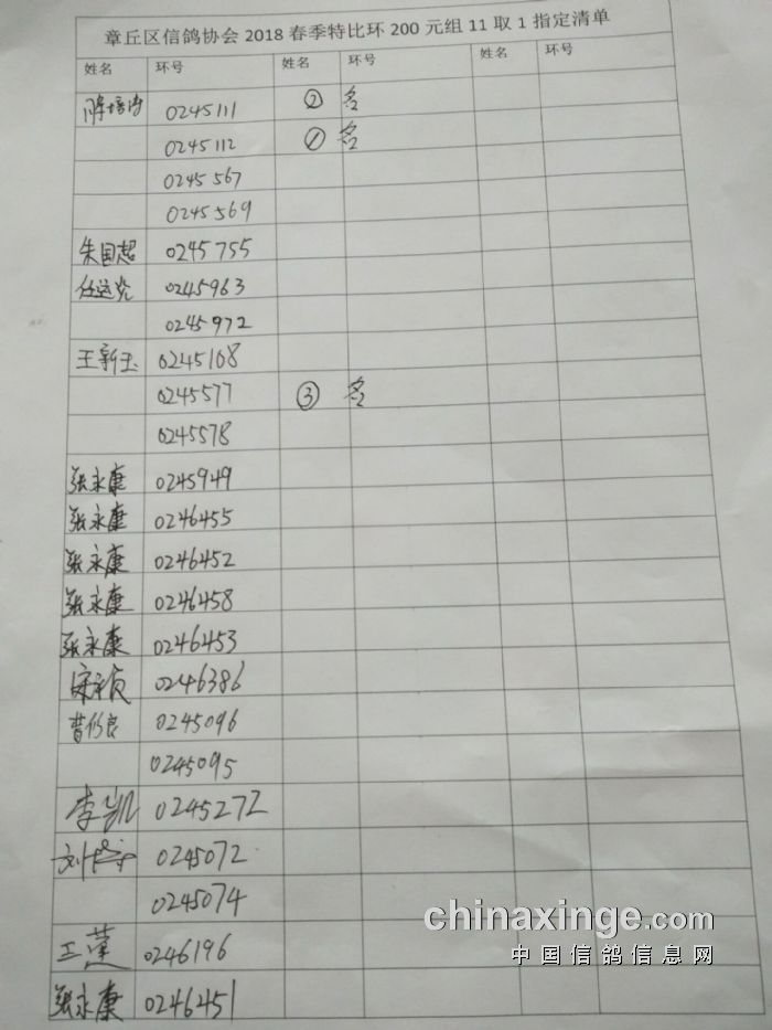 章丘区信鸽协会2023秋特比环验鸽清单
