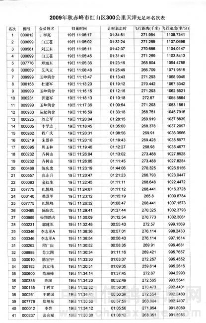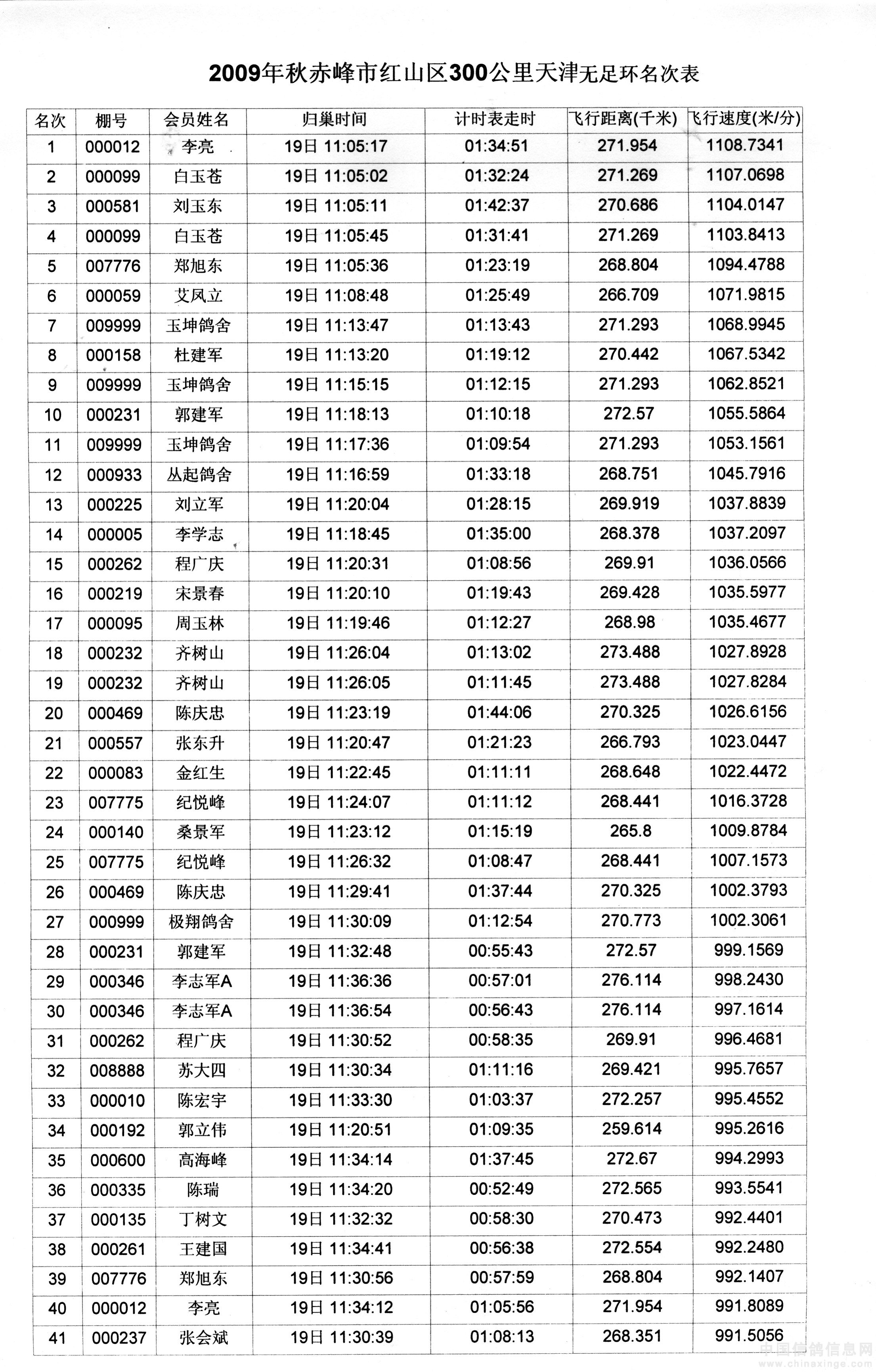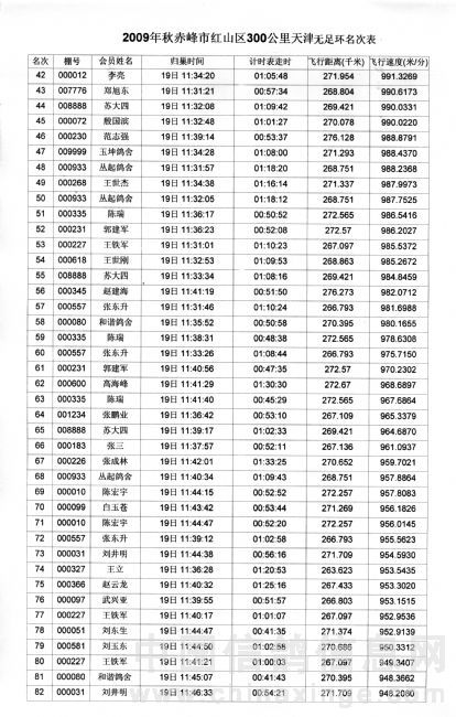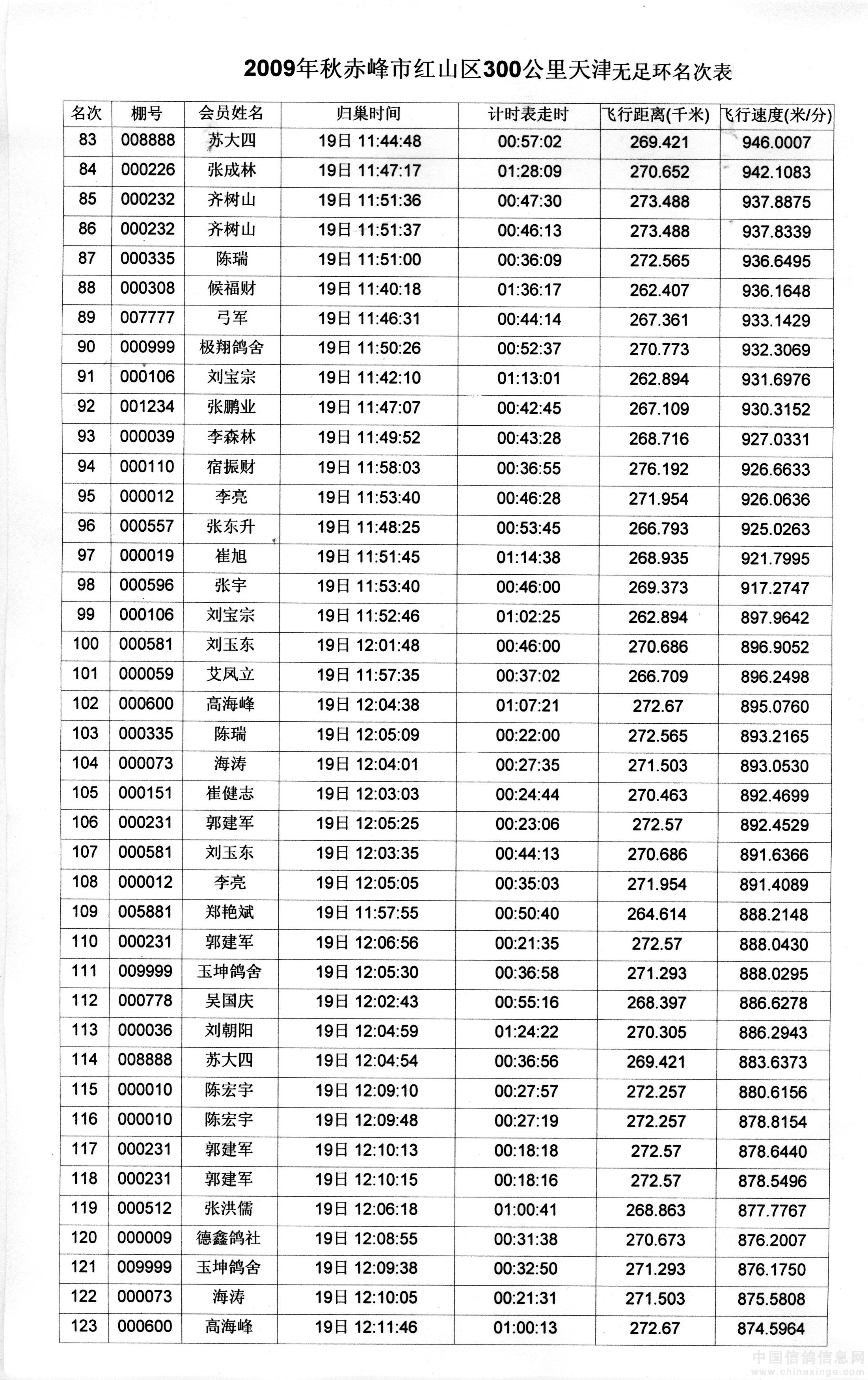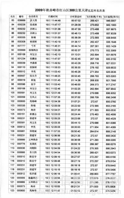 2009年9月19日赤峰市红山区信鸽协会300公里天津站前100名成绩