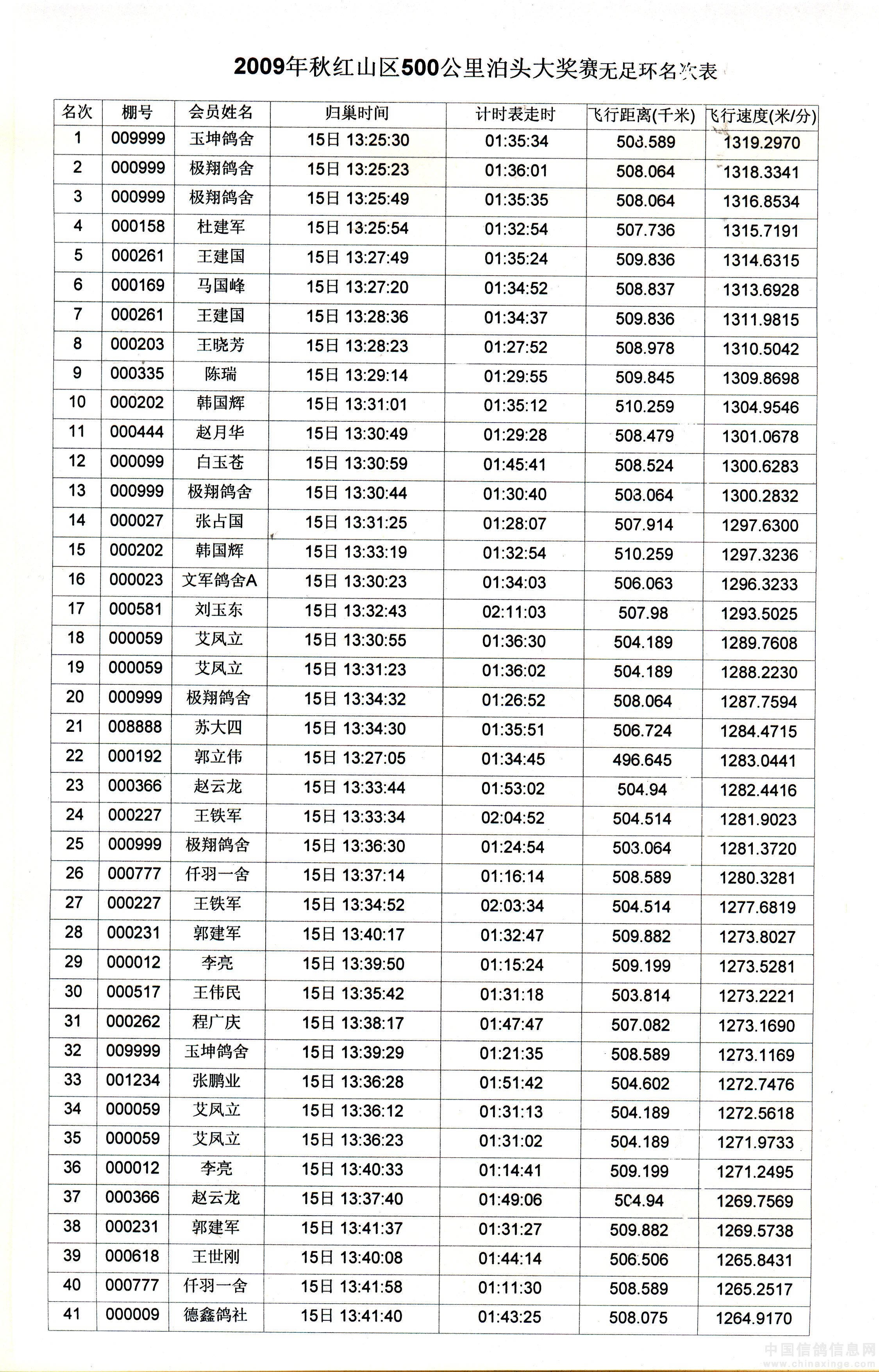 赤峰红山区2009年10月15日500公里赛成绩