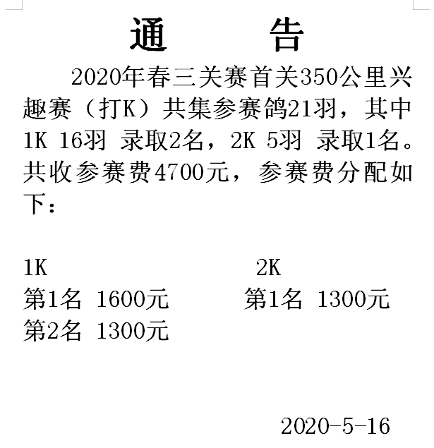 2020年春三关赛首关350公里兴趣赛(打K)奖金分配