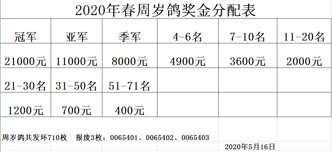 2020年春周岁鸽奖金分配