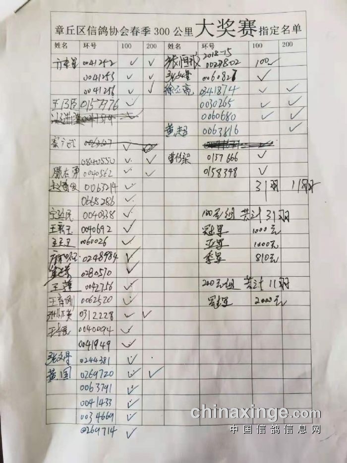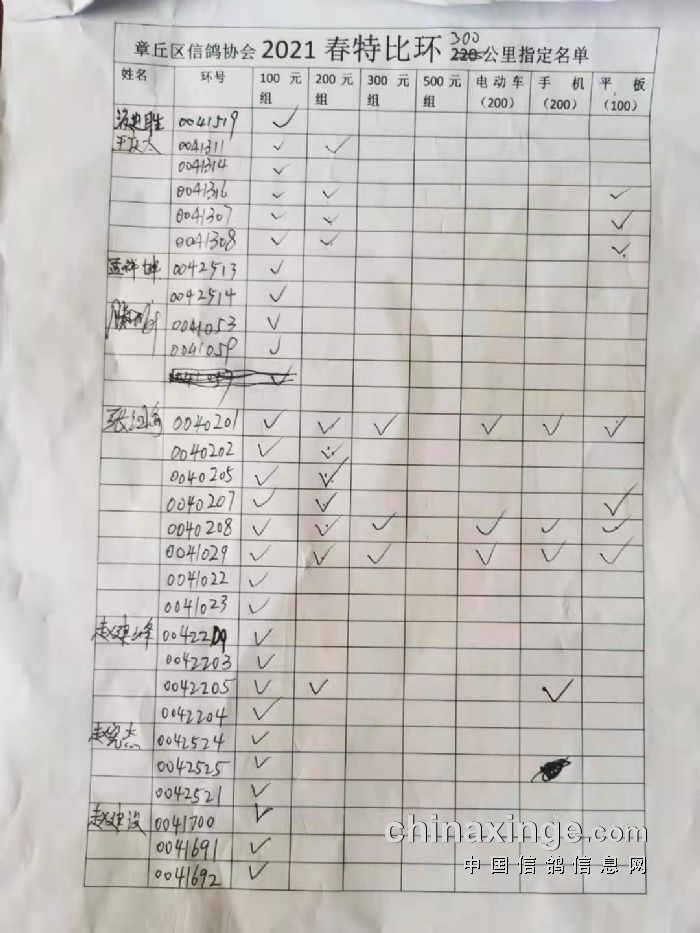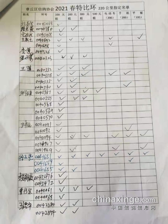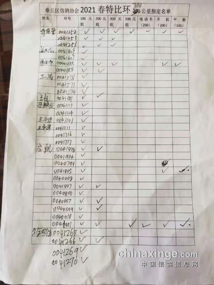 章丘区信鸽协会2021春300公里指定名单