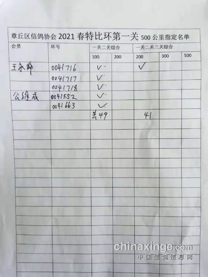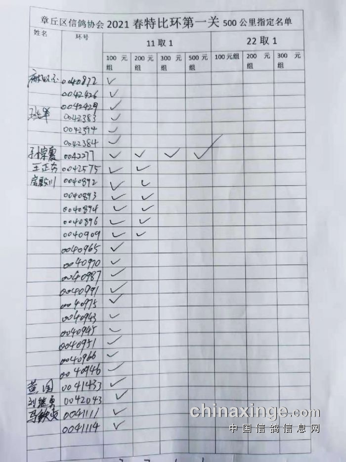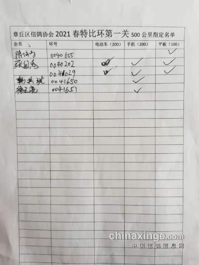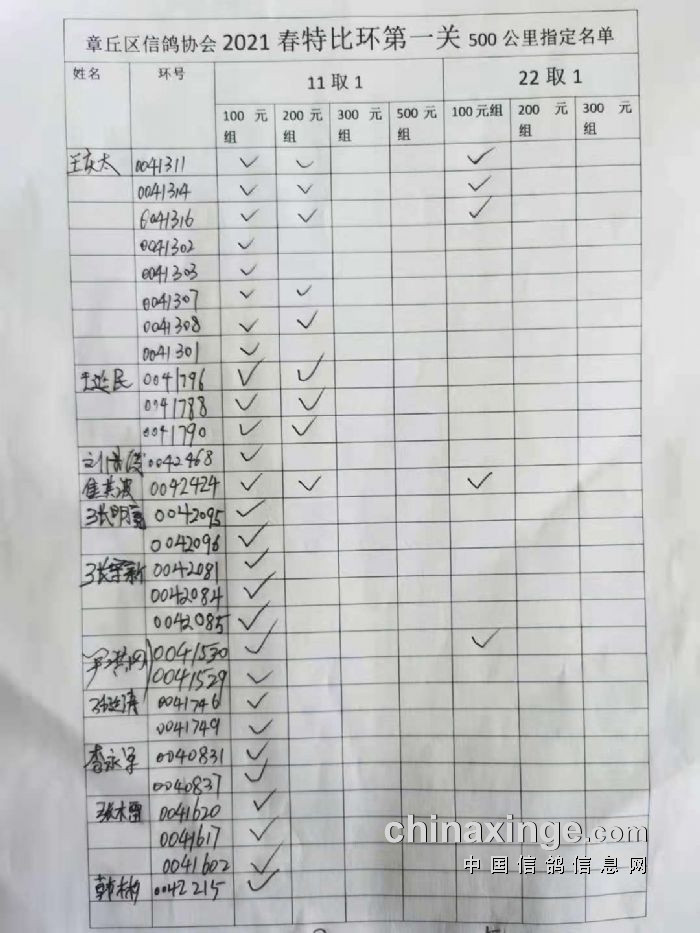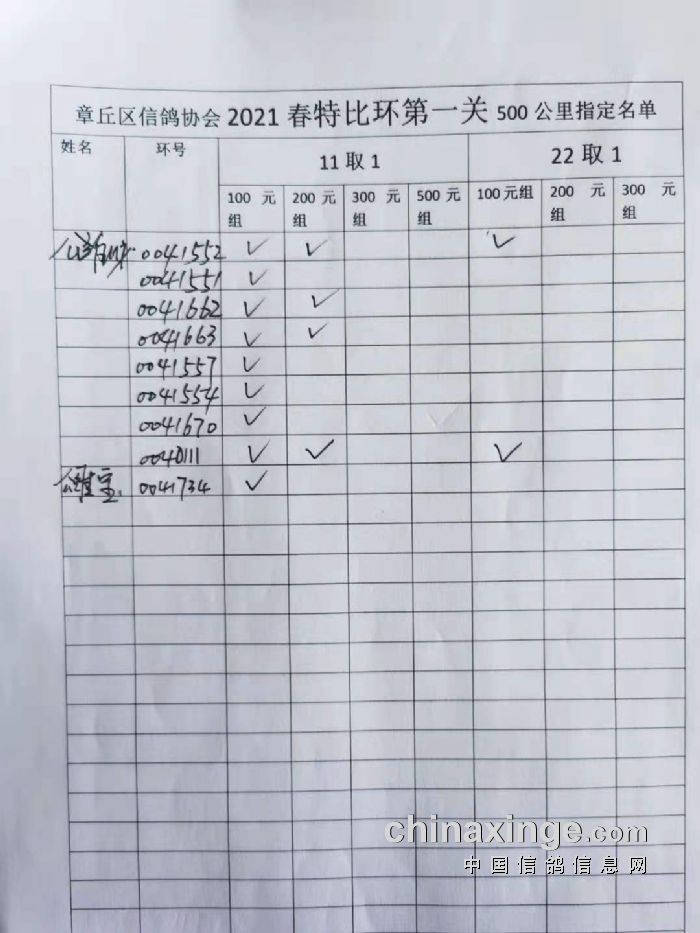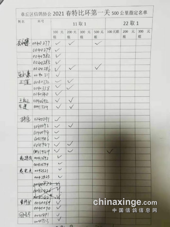 章丘区信鸽协会500公里第一关指定明细