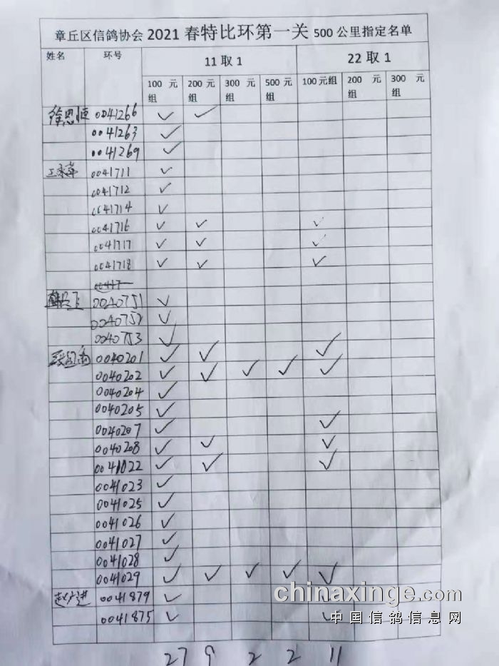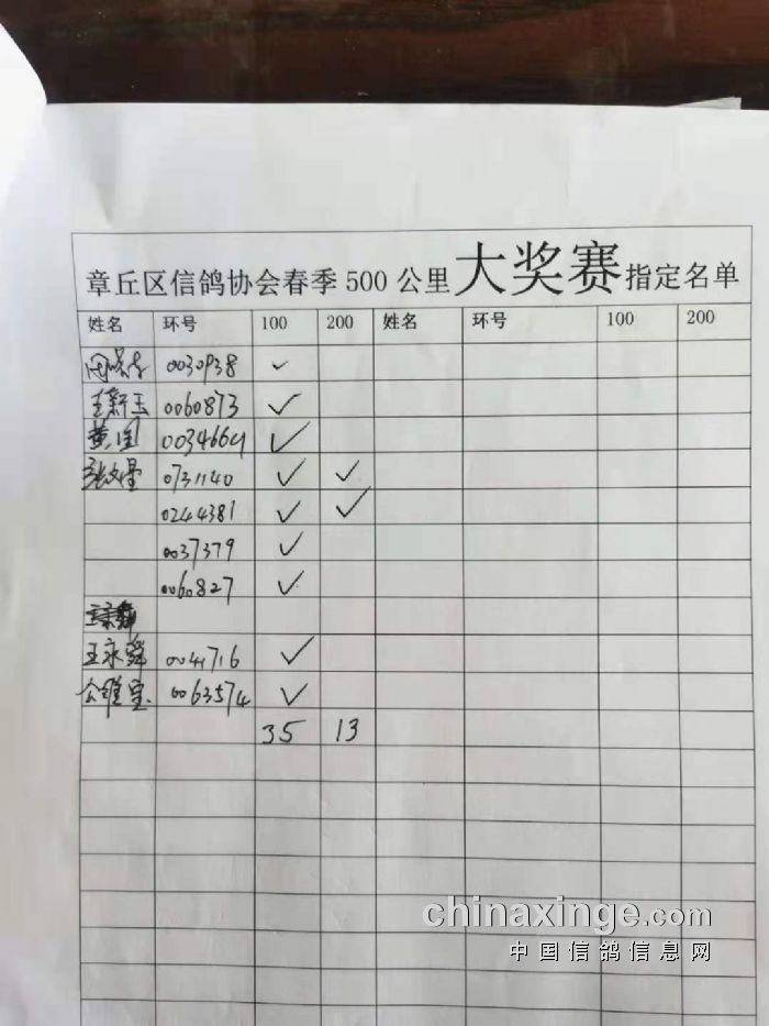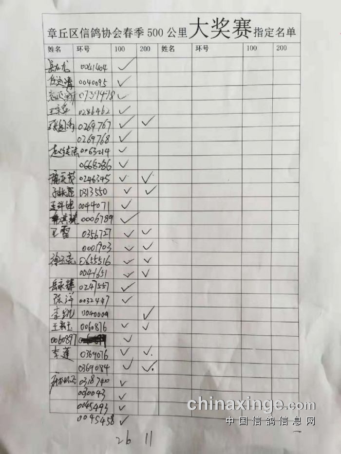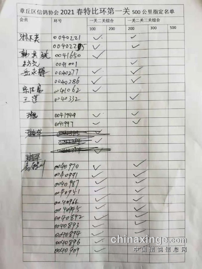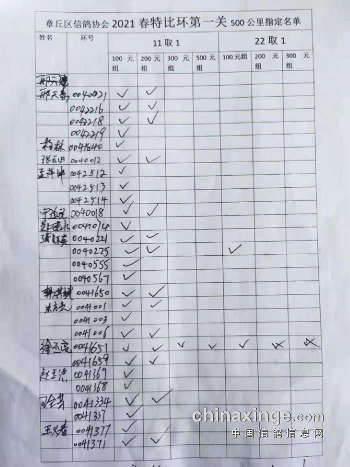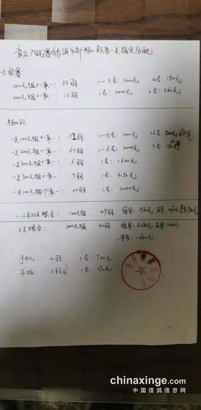 章丘区信鸽协会500公里第一关指定明细
