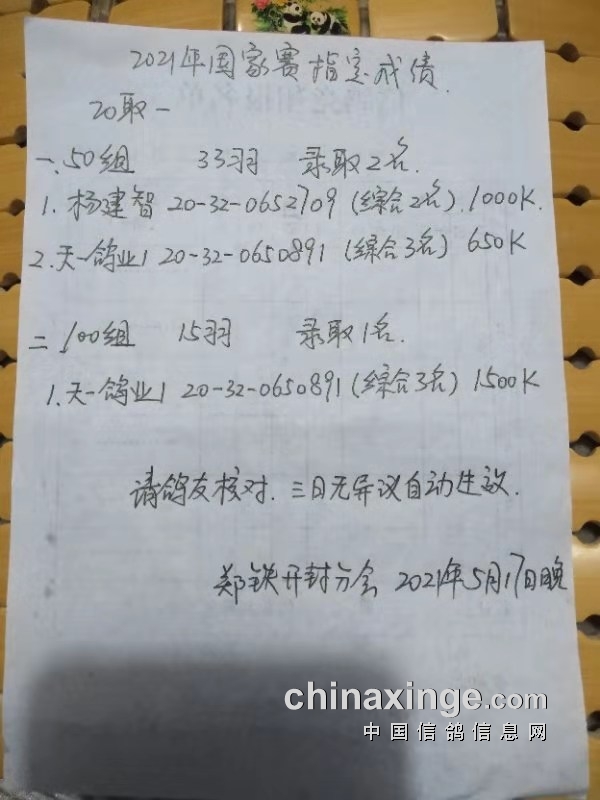 郑铁开封分会2021年春武汉赛区国家赛普赛指定鸽成绩