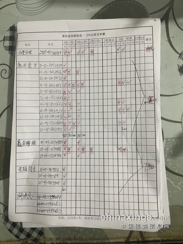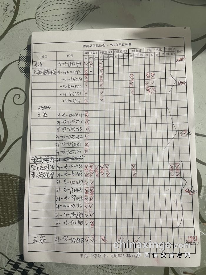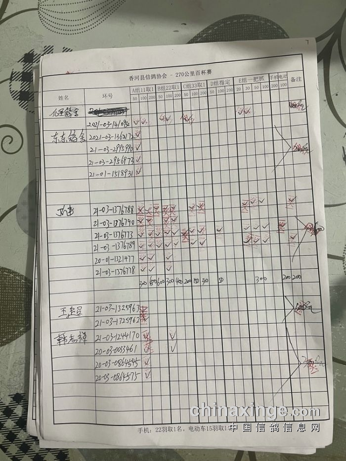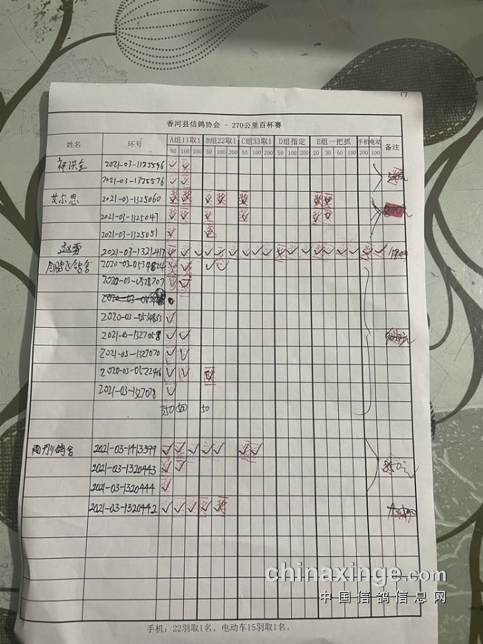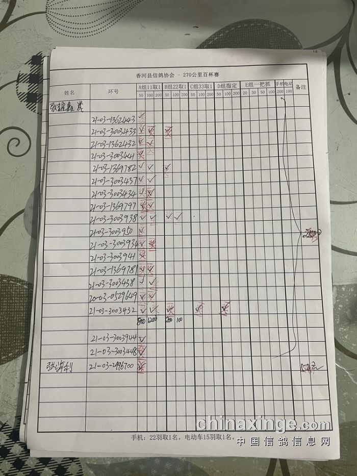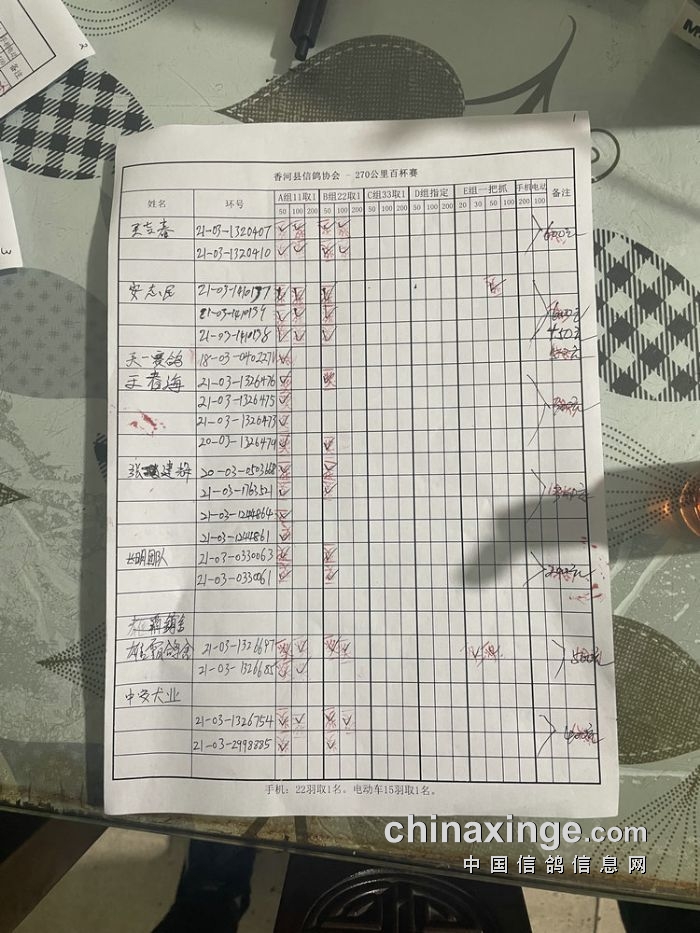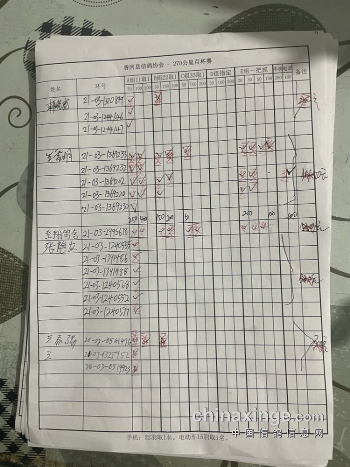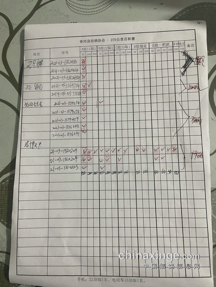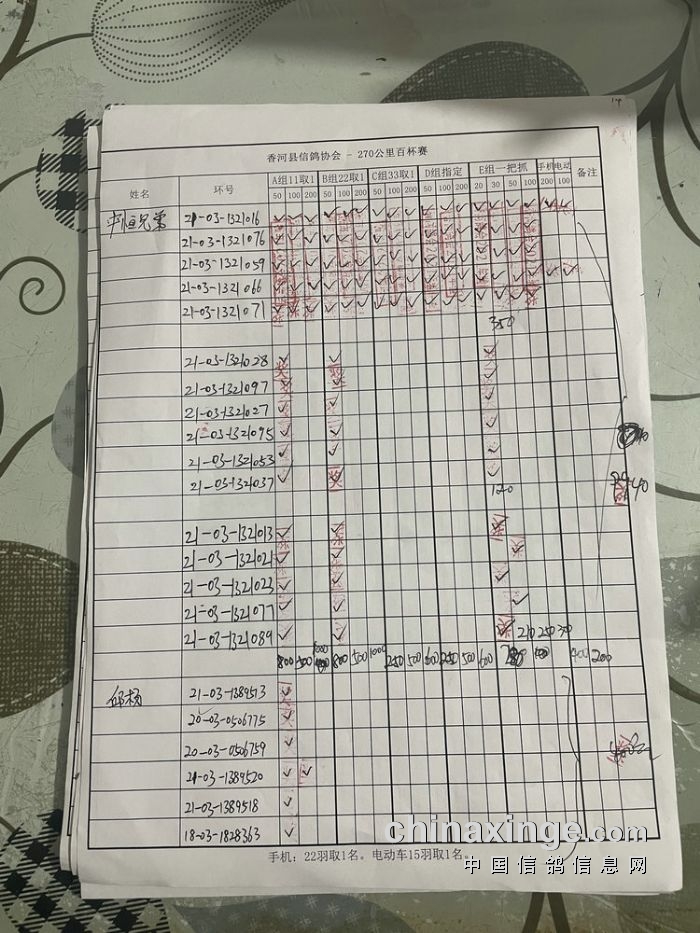 21秋香河县信鸽协会270公里百杯赛指定原单