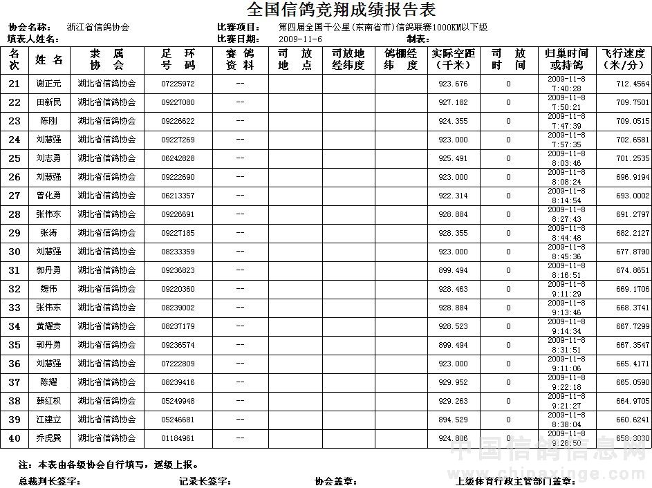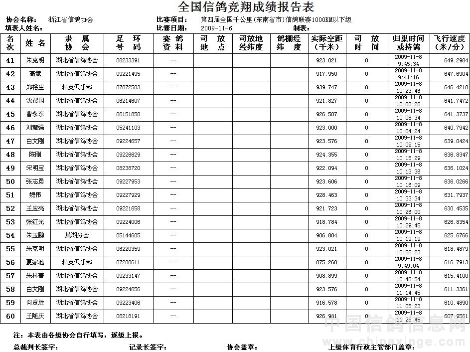 浙江省“鸿源杯”二届鸽王赛600KM级得分综合排名