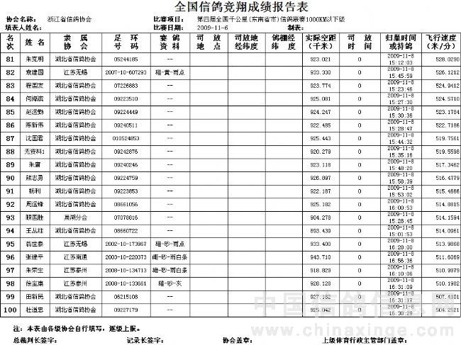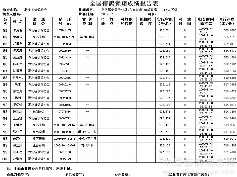 浙江省“鸿源杯”二届鸽王赛500KM级得分综合排名