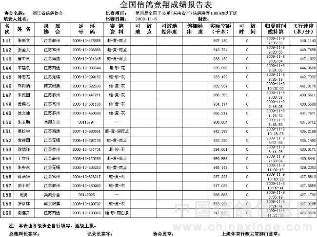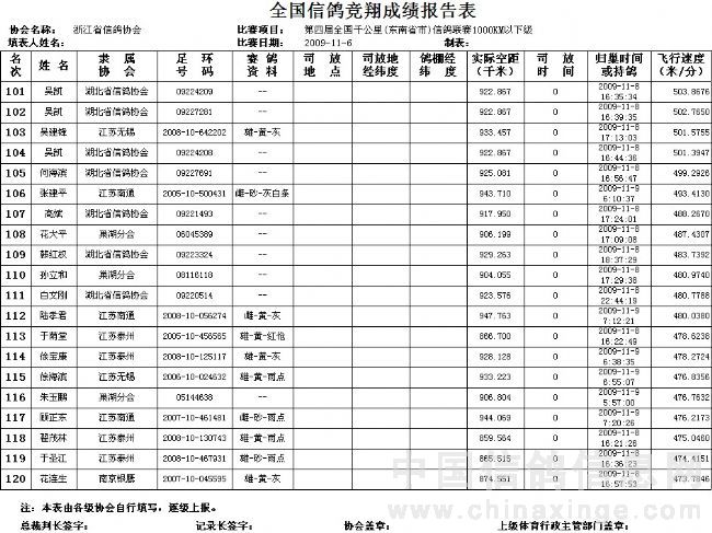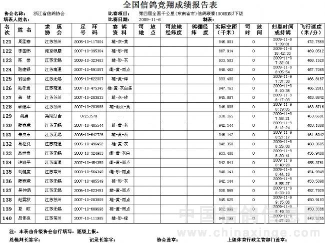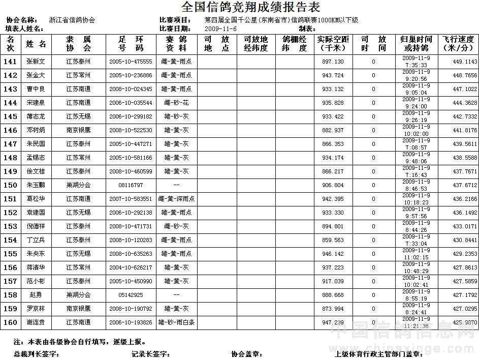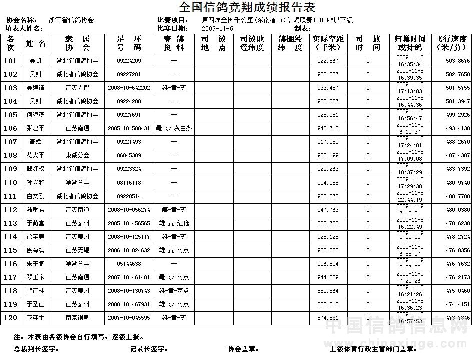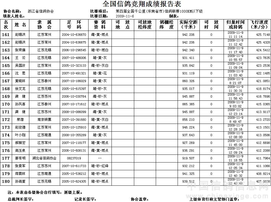 浙江省“鸿源杯”二届鸽王赛450KM级得分综合排名