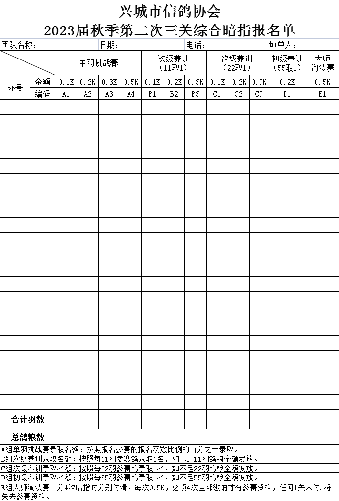 兴城市信鸽协会定于8月9日上午10点-下午2点开始三关综合暗指报名缴纳鸽币,具体暗指详情请参照以上报名单。