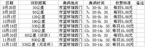注:如不参加训放,可以自己训放,但参加决赛时,每羽收费35.00元。