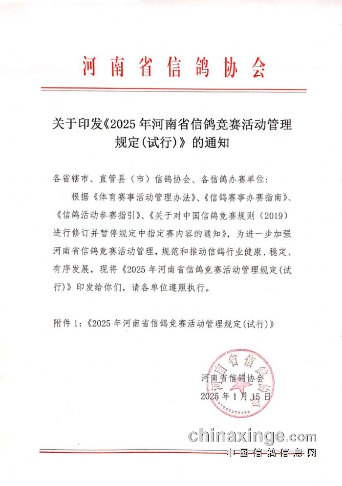 关于印发《2025年河南省信鸽竞赛活动管理规定(试行)》的通知