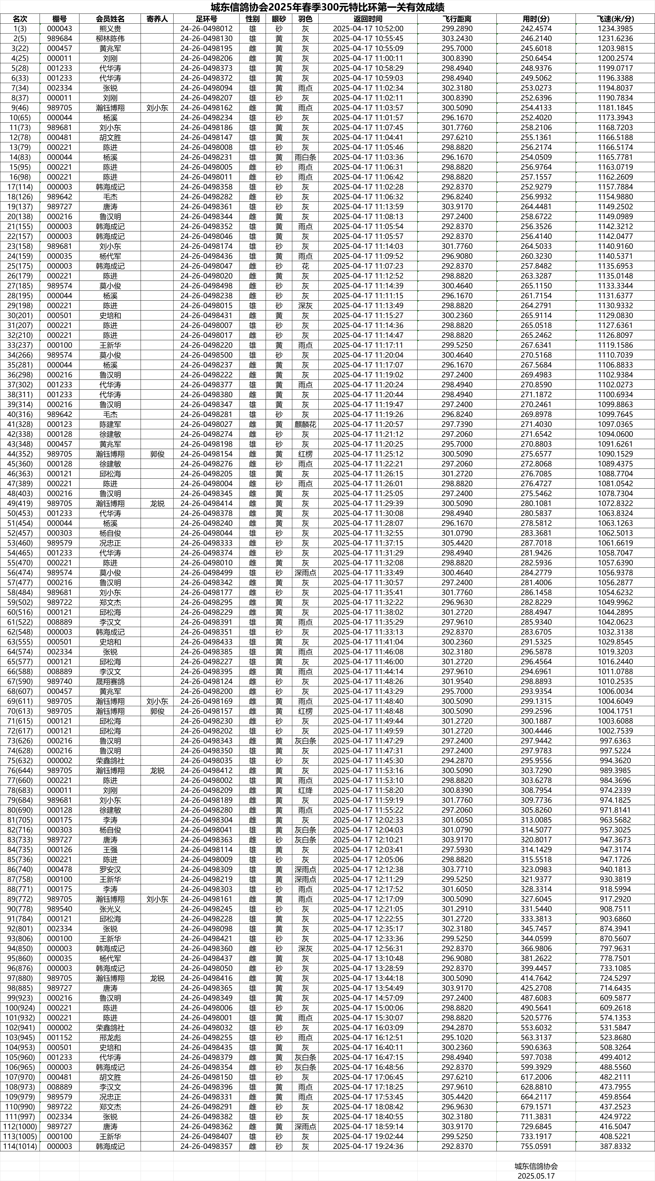 城东信鸽协会2025年春季300元特比环第一关有效成绩