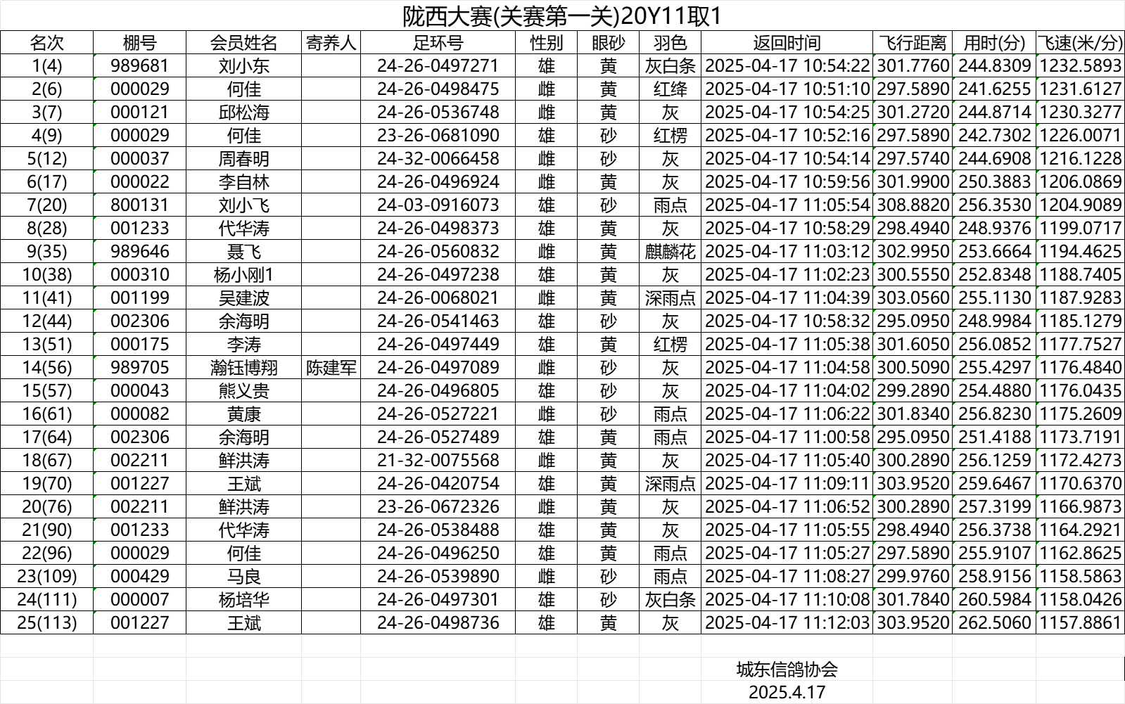 城东信鸽协会2025年春季三关育种训养赛100Y11取1(更正)