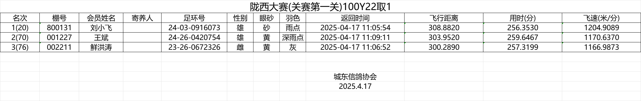 城东信鸽协会2025年春季三关育种训养赛100Y11取1(更正)